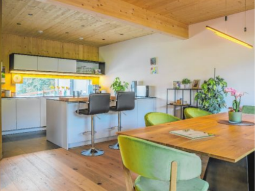 Natters – Am Ortsrand von Natters im Tiroler Mittelgebirge steht ein kompaktes Gebäude auf einem attraktiven Hanggrundstück, das herausfordernde und kreative Entwurfsideen erforderte. Beide Bauherren, Mutter und Sohn, vertrauten der Planungserfahrung und modernen Massivholz-Bauweise von Holzbau Schafferer aus Navis. Mit dem Team des Holzbauunternehmens setzten sie ihre Wohnträume nach dem „All-in-One“-Prinzip in kurzer Zeit schlüsselfertig um.