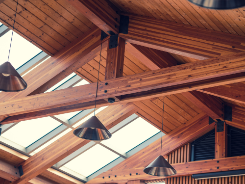 Die Holzbauweise wird im Inneren des Gebäudes hauptsächlich durch die Sichtholzdecken spürbar, sonst wurden auch hier graue Elemente mit hellen Wandflächen und schlichten Möbeln kombiniert.
