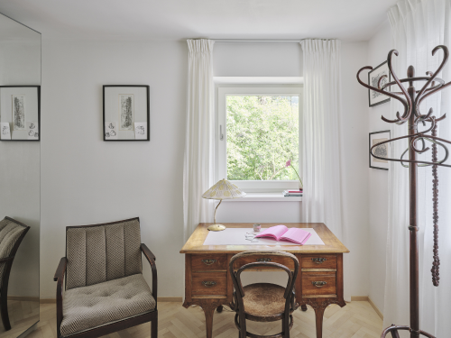 Denn außer der relativ geringen Raumhöhe von 2,40 Metern blieb praktisch nichts, wie es war. Und das, obwohl im Detail möglichst viel erhalten bzw. geschickt transformiert worden ist. Etwa die bestehen den Küchenmöbel, die durch neue Fronten aus puderfarbigem Tischlinoleum und einer Arbeitsplatte aus Holz optisch geschickt aufgemotzt worden sind.