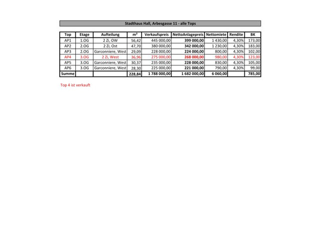 Die Wohnungsgrößen der sechs Wohn-Einheiten ist optimal auf eine hohe Rendite ausgelegt, mit kleinen kompakten Einheiten! Im Anhang eine Hochrechnung der Einnahmen anhand realer Umsatzzahlen eines vergleichbaren Objektes in Hall!