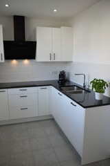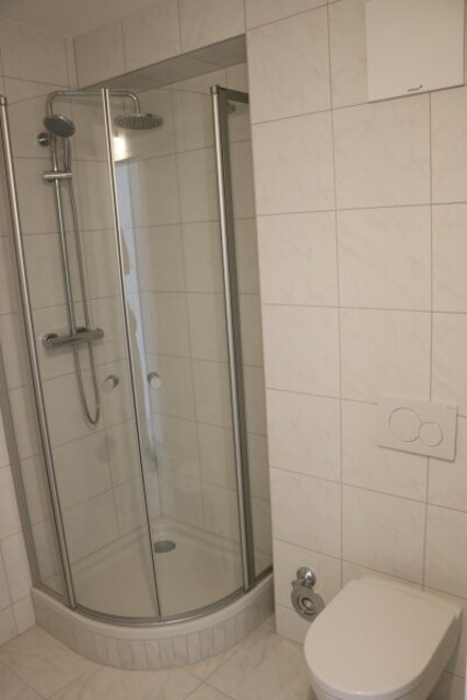 - Boden: Vinyl - schwarz in Fliesenoptik, im Bad Fliesen