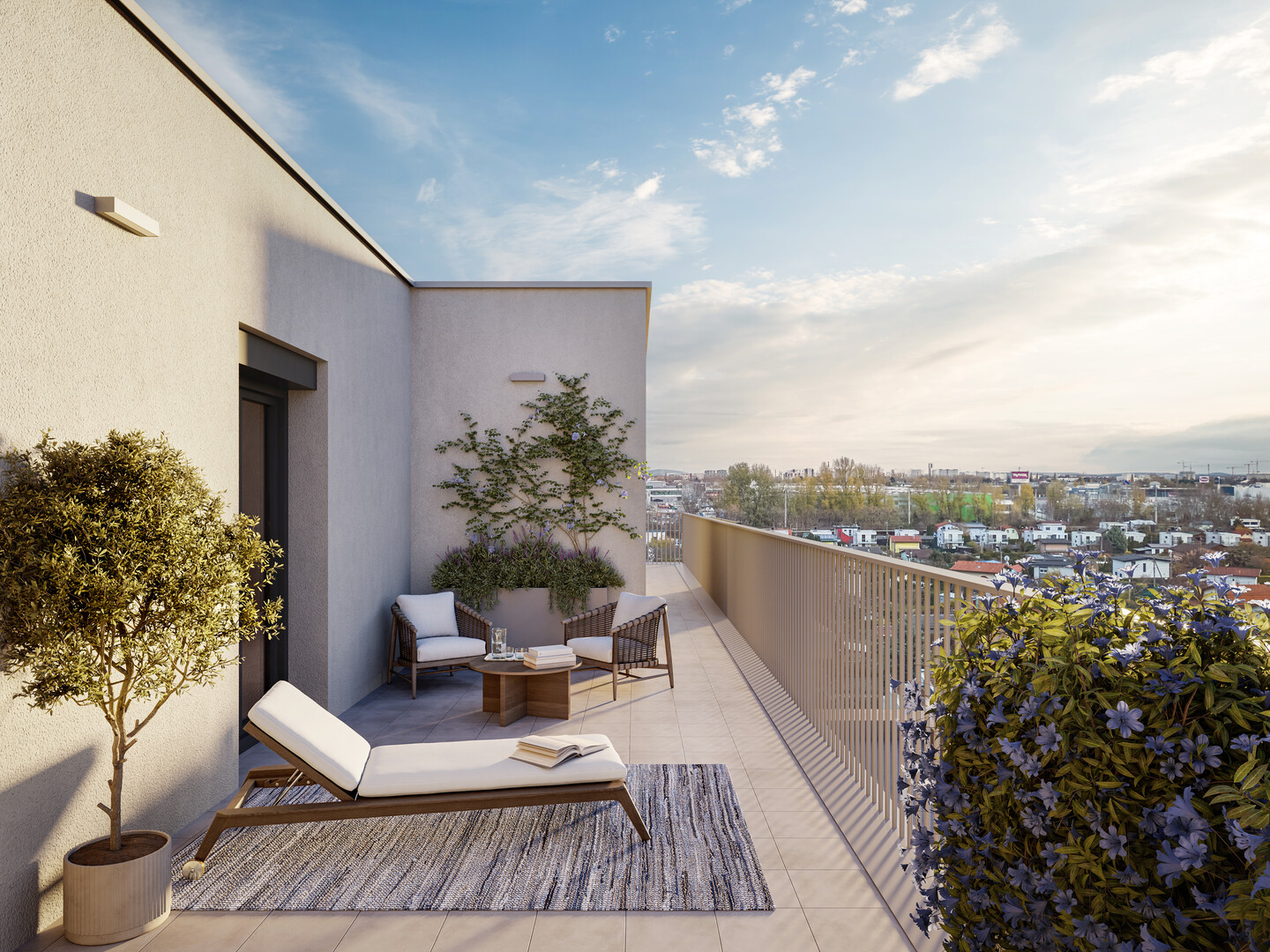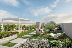 Großzügige Balkone und Terrassen mit integrierten Pflanzmöglichkeiten erweitern den Wohnraum ins Freie und laden zur Gestaltung persönlicher Grünoasen ein. Bodentiefe Fenster bringen viel Tageslicht in die Wohnungen und schaffen fließende Übergänge zwischen Innen- und Außenbereich. Zusätzlich stehen auf den Dachflächen individuell erwerbbare Garten- und Hochbeete zur Verfügung – ideal für alle, die Freude an urbanem Gärtnern haben. Gemeinschaftliche Freiflächen mit Sitzmöglichkeiten und Pergola bieten Platz für Erholung und Begegnung mit beeindruckendem Ausblick. Ein begrünter Innenhof mit vielfältigen Spiel- und Aufenthaltsmöglichkeiten ergänzt das Angebot und sorgt für hohe Aufenthaltsqualität direkt im Haus.