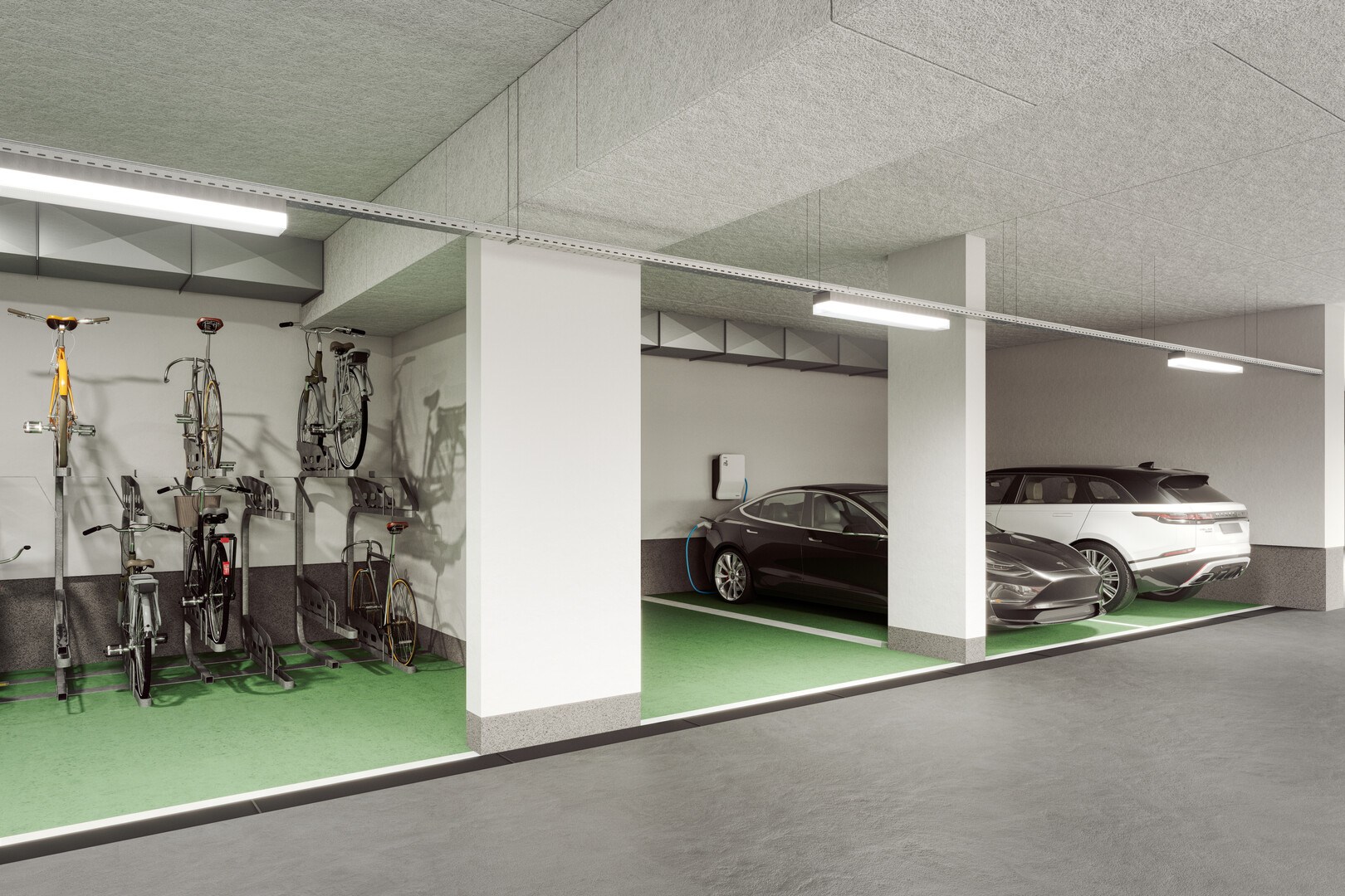 • Tiefgarage mit ca. 100 Stellplätzen, alle E-Mobilität-vorbereitet