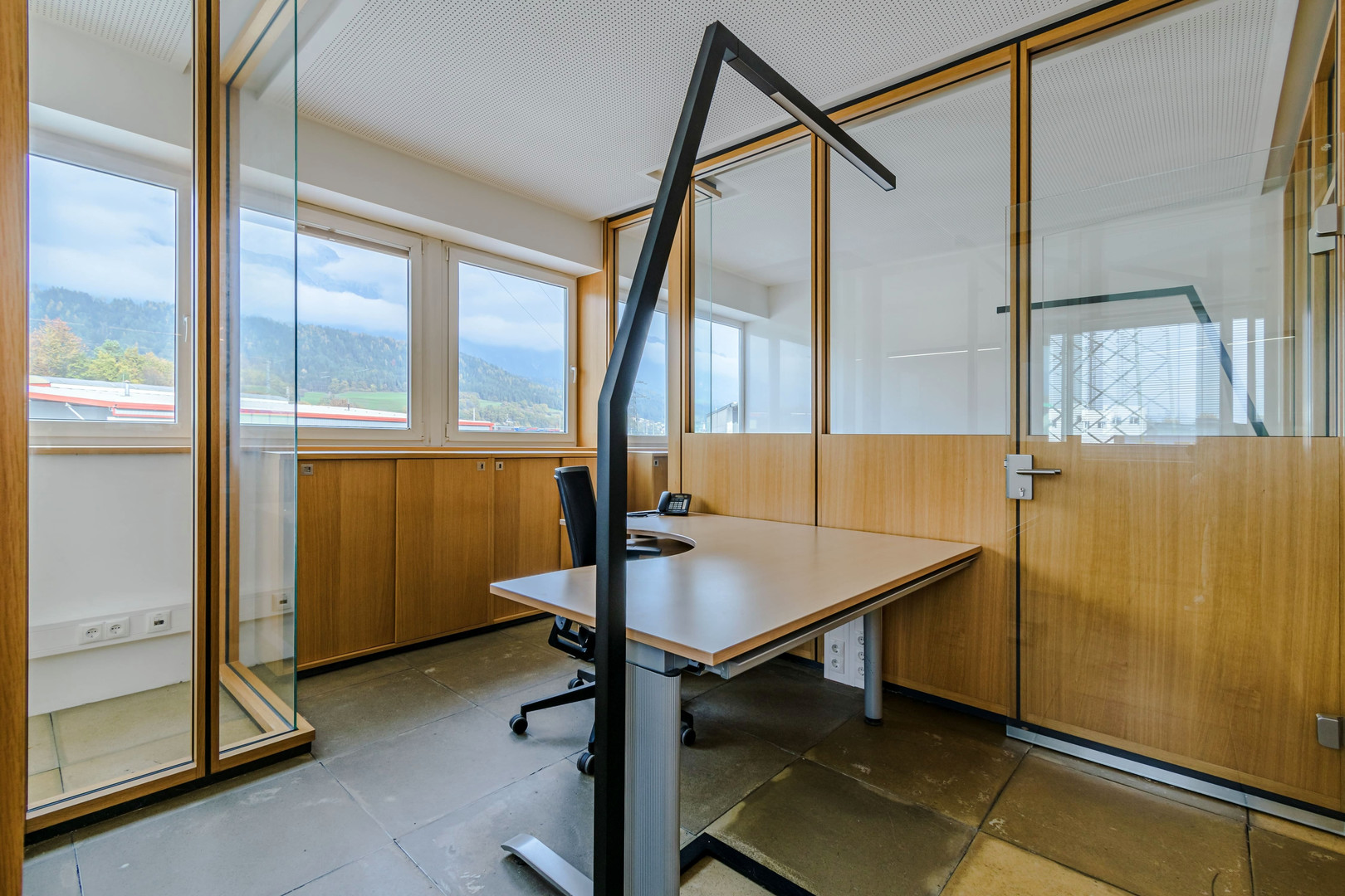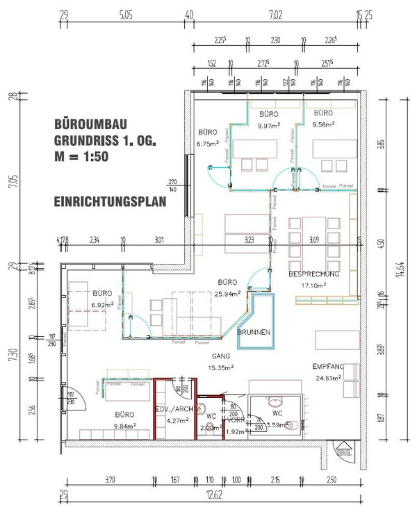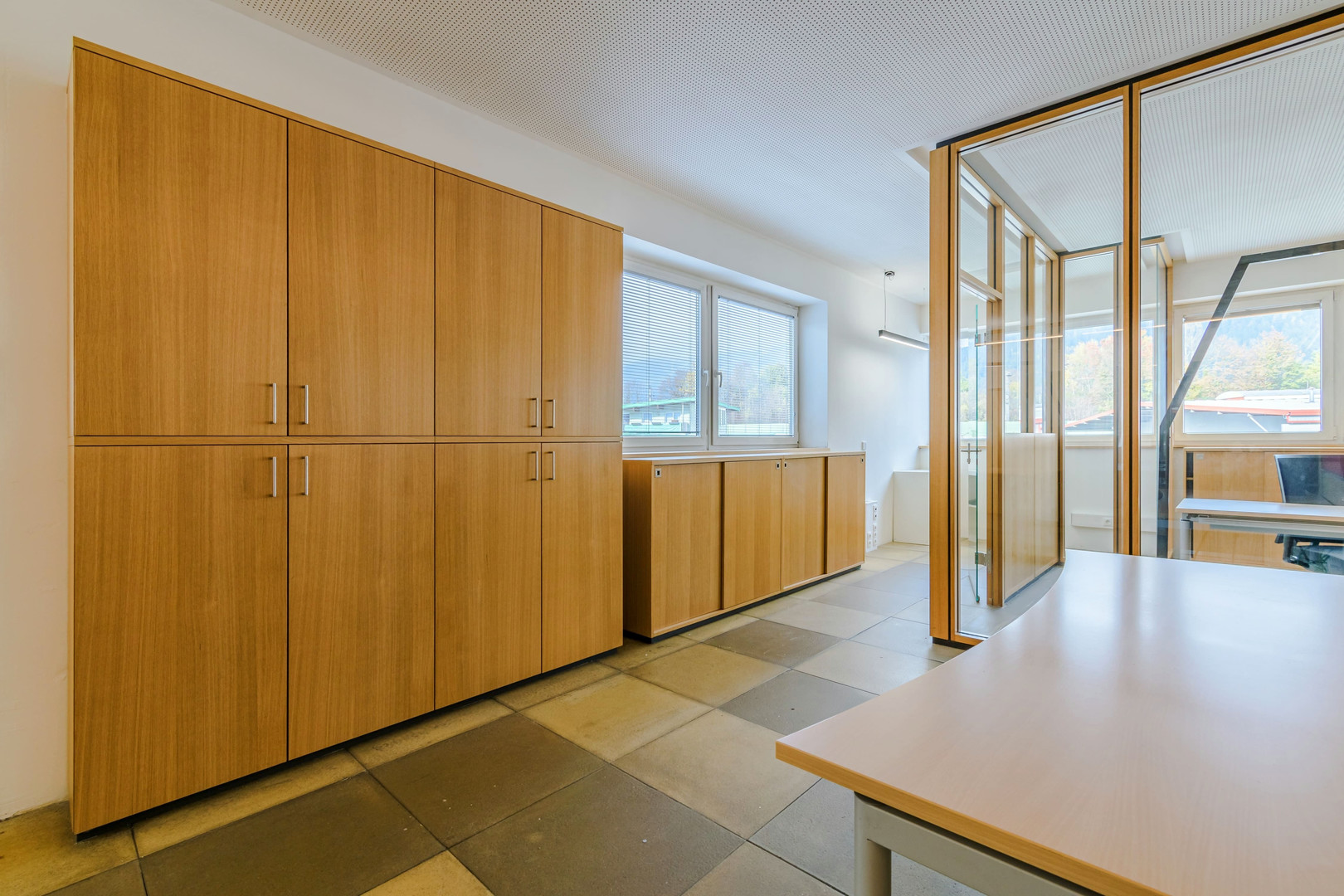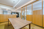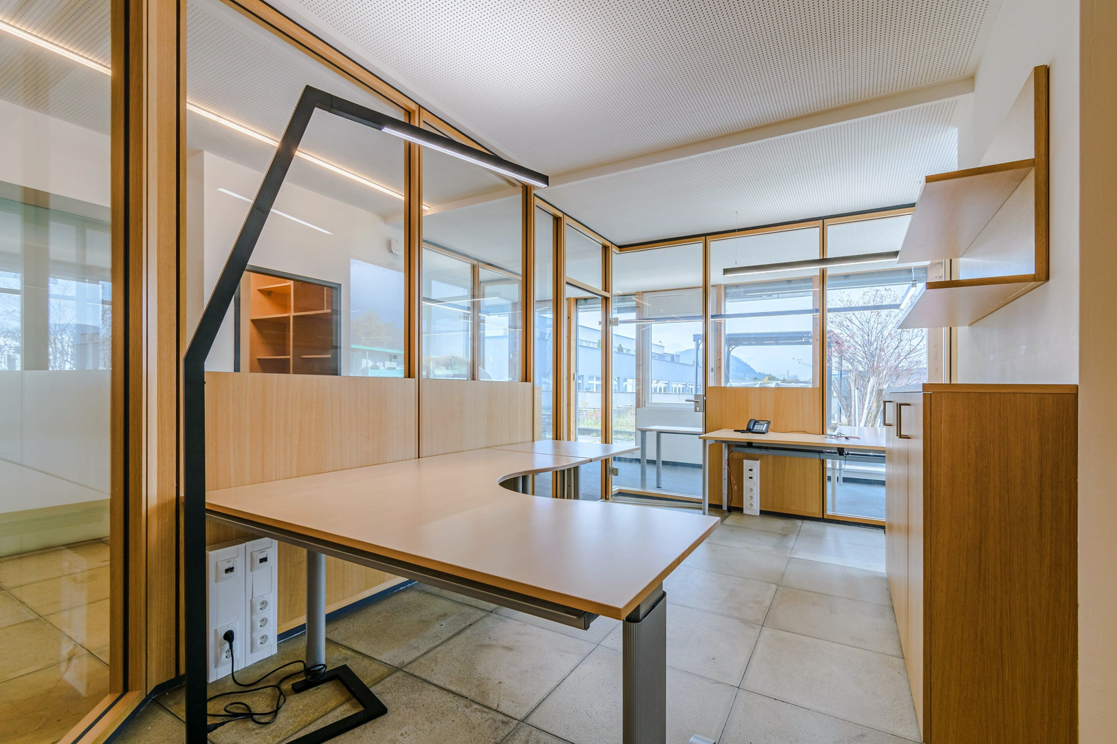 Die Bürofläche bietet Platz für bis zu 10 moderne Arbeitsplätze und ist optimal in verschiedene Bereiche unterteilt: Ein einladender Empfangsbereich heißt Kunden und Geschäftspartner professionell willkommen. Separate Einheiten für Besprechungszimmer, Serverraum und individuell nutzbare Büroräume sorgen für eine funktionale Raumstruktur. Die Trennwände aus einer Kombination von Holzbauweise und Sicherheitsglas schaffen eine angenehme Arbeitsatmosphäre mit Lichtdurchflutung und akustischer Privatsphäre.