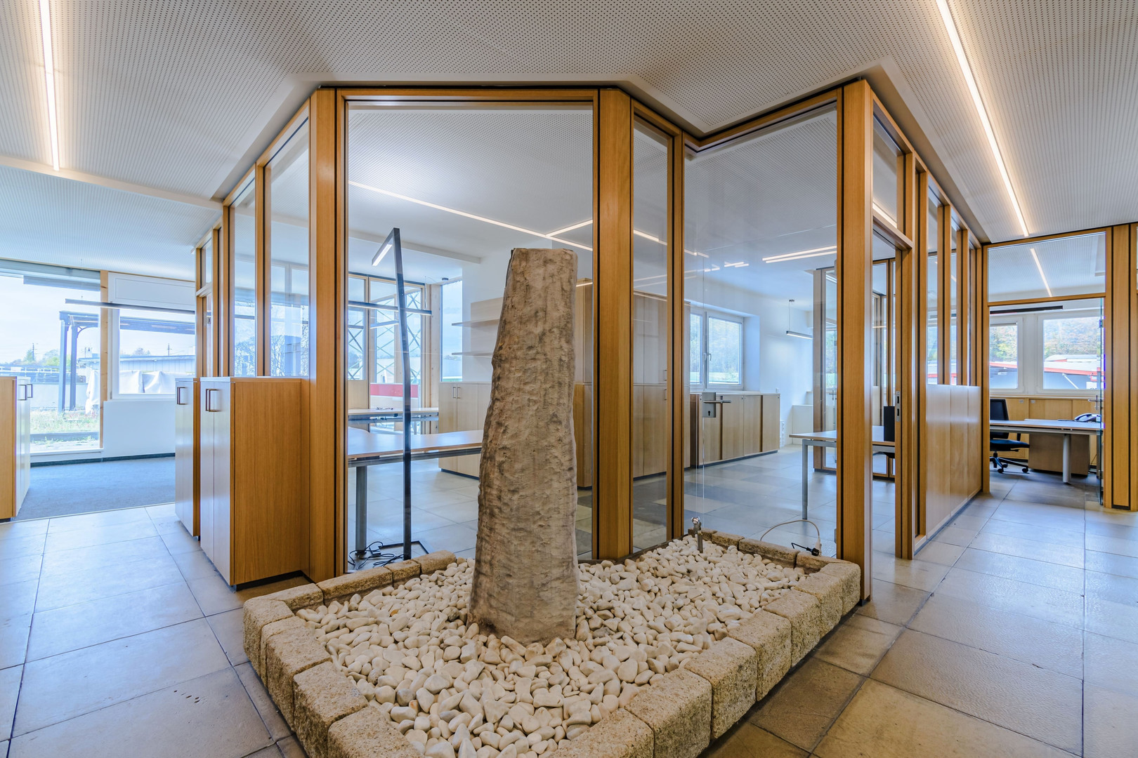 Zur hochwertigen Ausstattung zählen eine moderne Teeküche mit Kühlschrank und Geschirrspüler, durchdachte Büroeinbaumöbel, stilvolle Beleuchtung sowie eine komfortable Deckenkühlung (Klimaanlage). Die Beheizung erfolgt über eine Fußbodenheizung, die durch eine nachhaltige Grundwasserwärmepumpe betrieben wird. Ein dekorativer Steinbrunnen unterstreicht die exklusive Gestaltung und verleiht dem Objekt ein besonderes Flair.