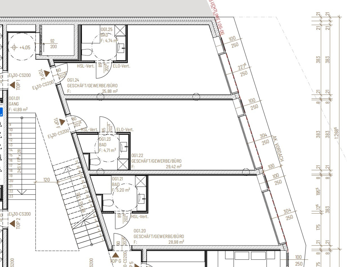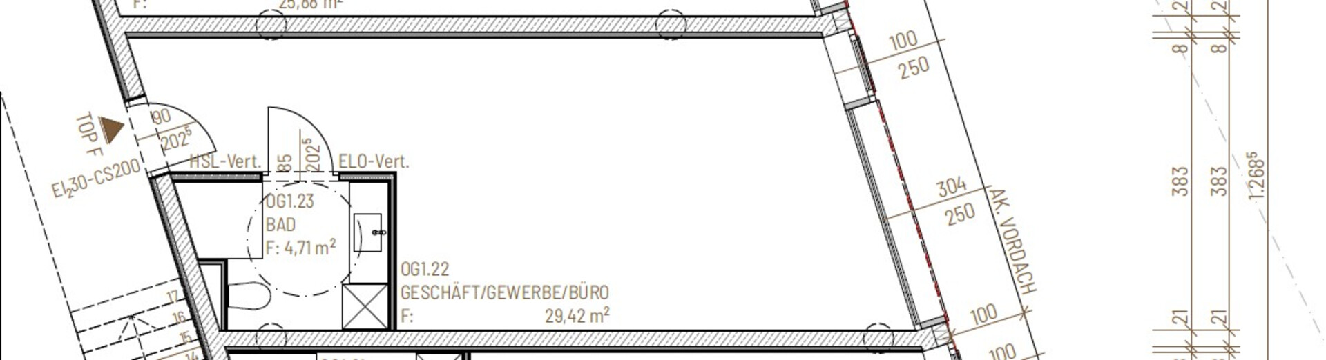 Im Erdgeschoss wird eine weitere Gewerbefläche - G3- vermietet, diese hat eine Nutzfläche von 60,94m² und verfügt über eine Räumhöhe von 3,20m.