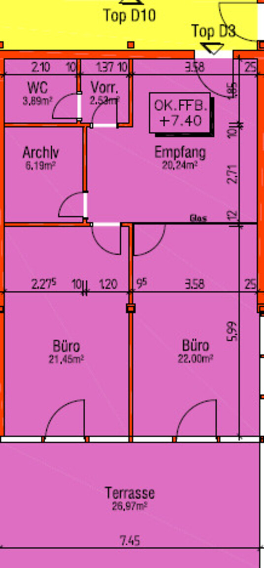 Die Raumaufteilung umfasst zwei separate Einzelbüros, die ein ruhiges und konzentriertes Arbeiten ermöglichen. Ergänzt wird die Einheit durch eine Teeküche, ein WC sowie ein Archiv, das praktischen Stauraum für Unterlagen und Arbeitsmaterial bietet.