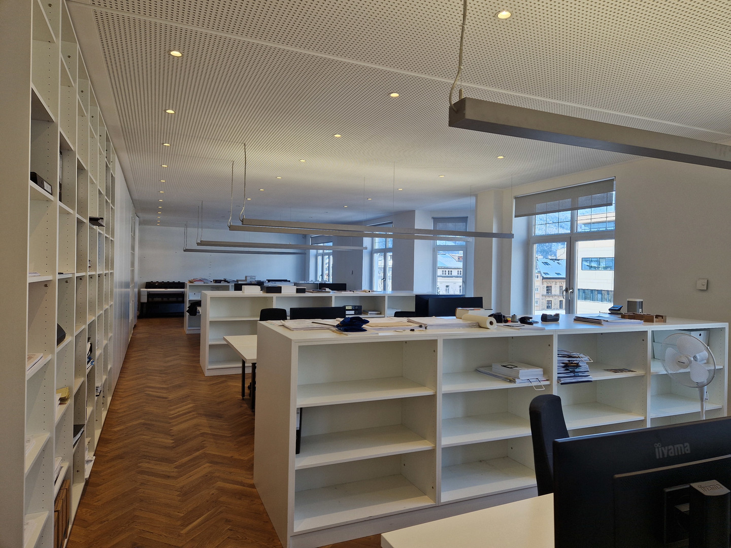 Auf der linken Seite des Eingangsbereichs befindet sich der Empfang, zwei Einzelbüros, der lichtdurchflutete Besprechungsraum, eine Teeküche, ein kleiner Abstellraum und eine Toilette.