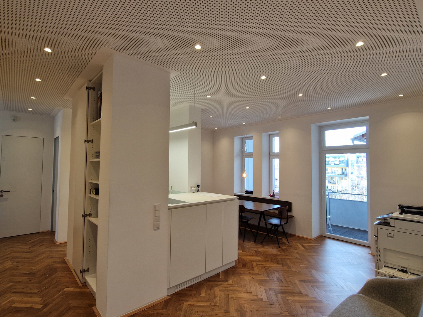 Rechtsseitig davon gelangen Sie in die großzügig gestaltete Gemeinschaftsküche, in ein weiteres Einzelbüro und in eine Toilette.