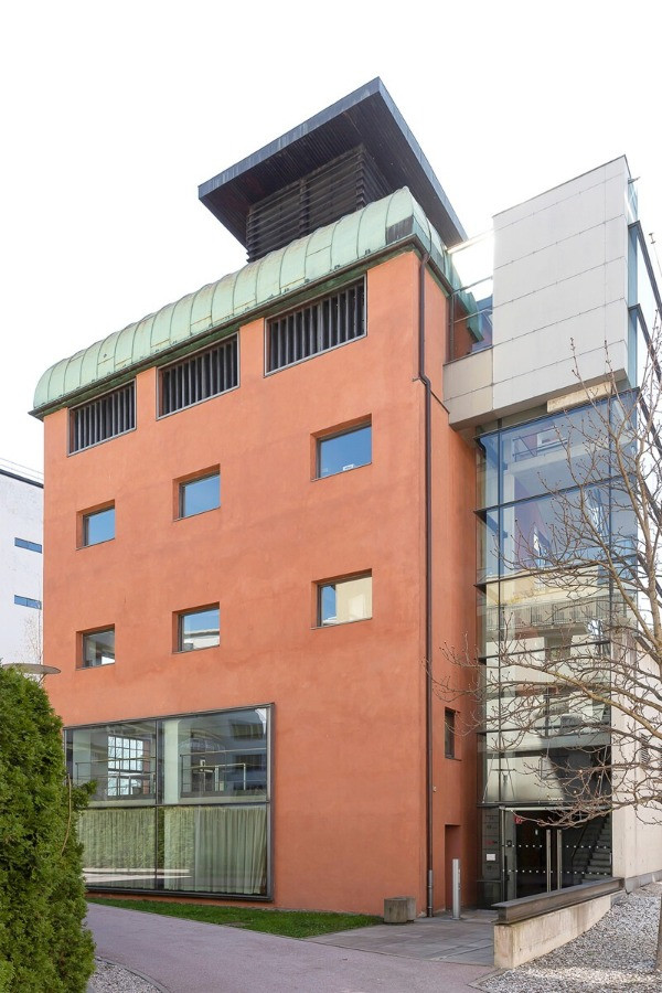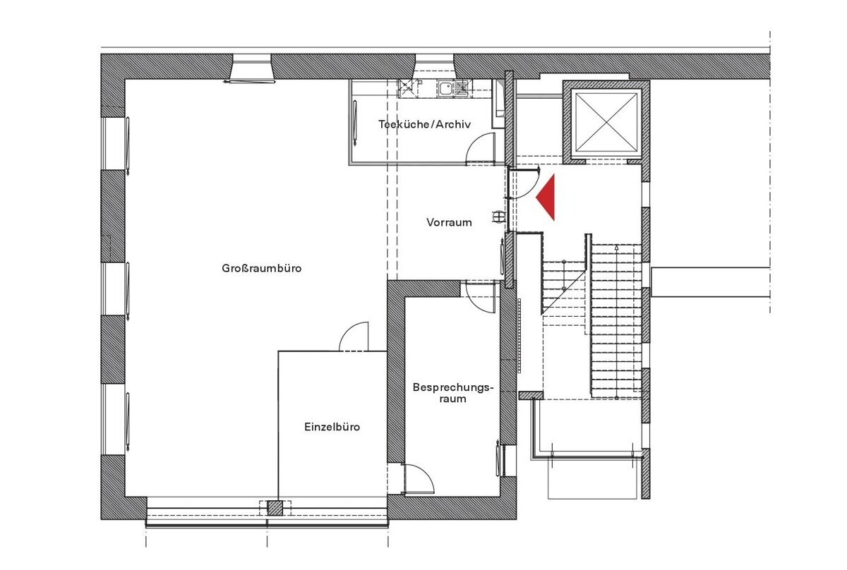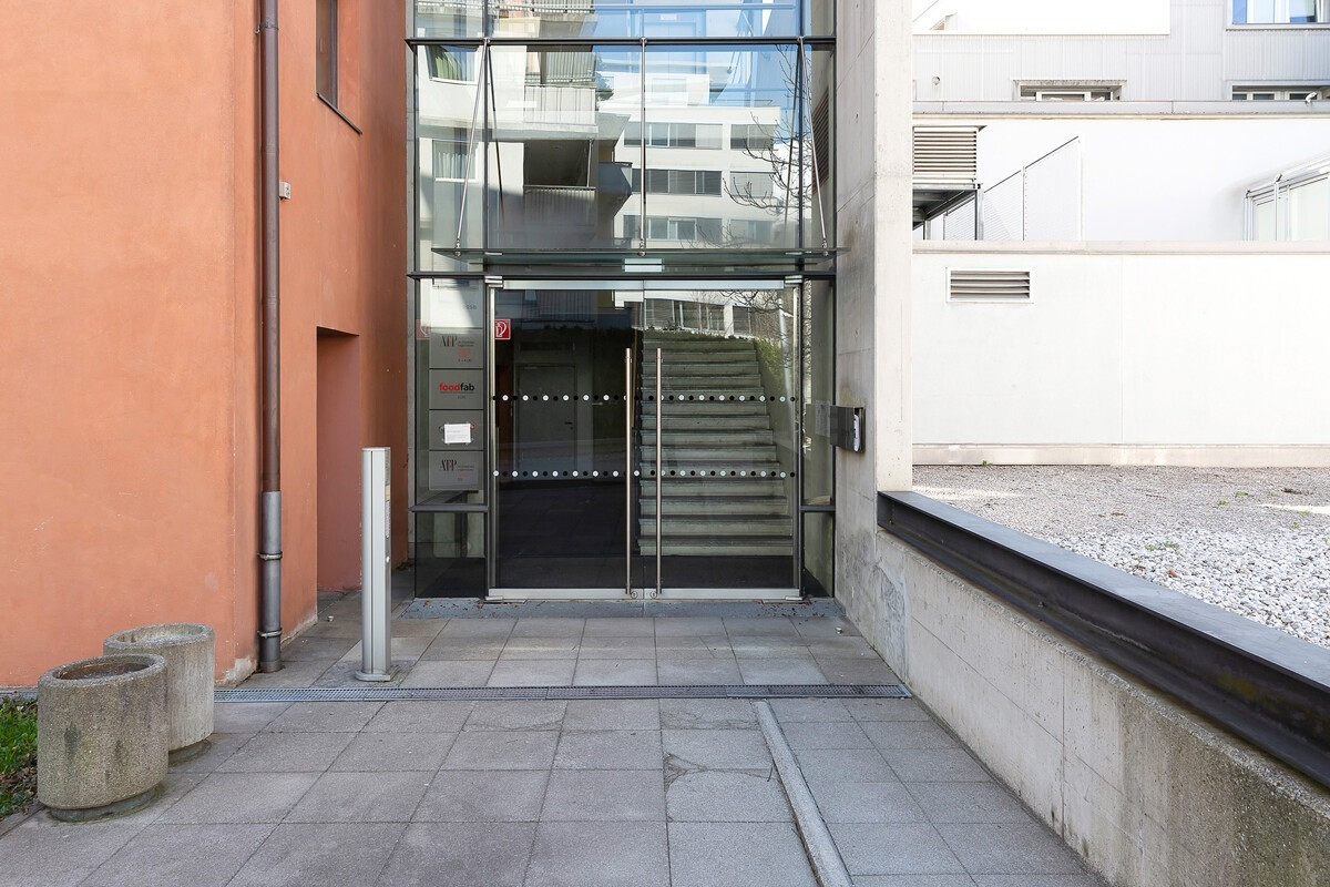 Das Büro überzeugt neben der architektonisch ansprechenden Aufteilung und den großflächigen Fensterflächen vor allem durch den repräsentativen Zugang.