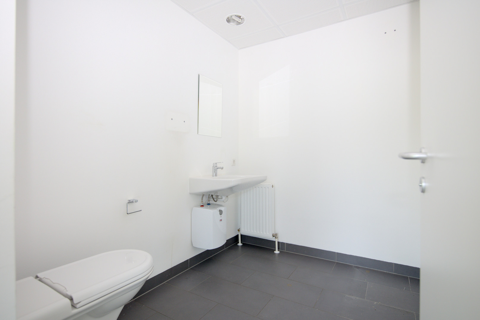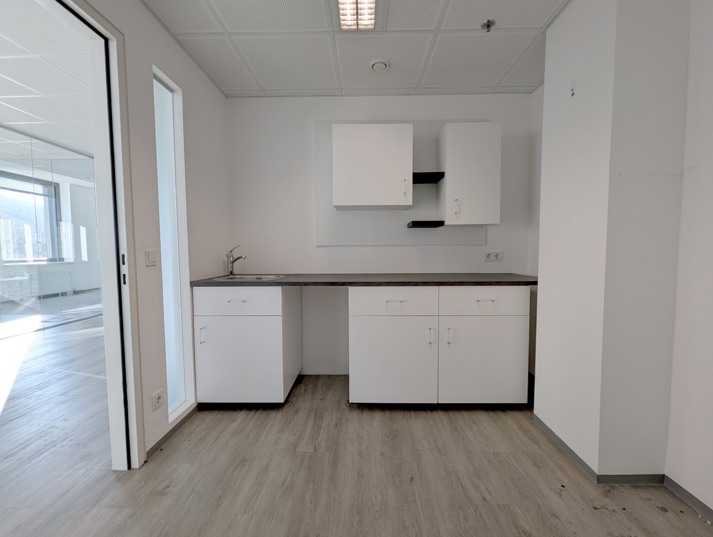 Die Fläche im 2. Obergeschoss bietet einen großzügigen, offenen Empfangs- oder Eingangsbereich, helle, ruhige Büroräume, einen separaten Aufenthaltsraum (z. B. für Küche oder Pausenbereich) und ein Behinderten-WC.