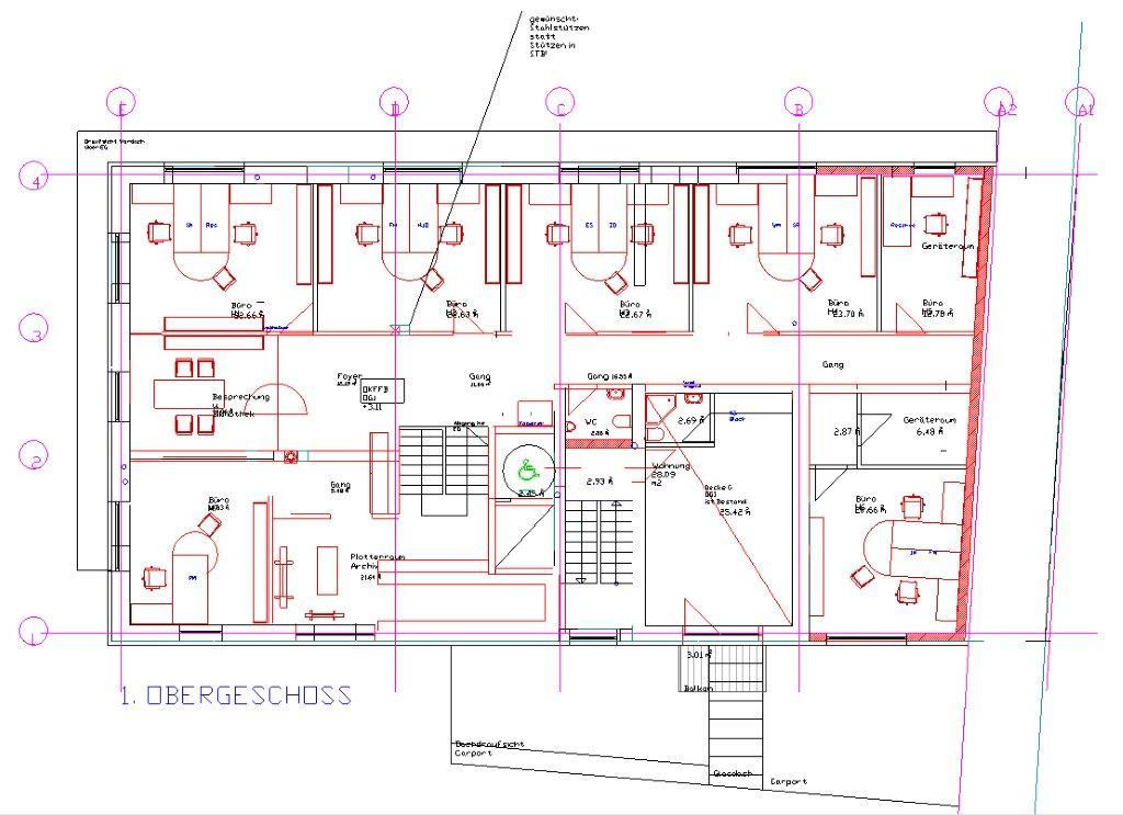 • OG1 mit 267 m²: 7 Büroräume, 2 Besprechnungszimmer, 1 Konferenzraum, Technikraum, 2 WC, 1 Dusche