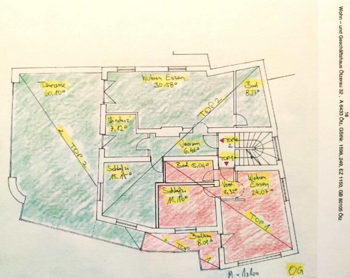 Die im Obergeschoß und im Dachgeschoß gelegenen Wohneinheiten Top W 1-4 werden über einen eigenen Zugang und ein allgemeines Stiegenhaus erschlossen. Über dieses Stiegenhaus sind auch die im Kellergeschoß befindlichen Lagerräume von Top G1 und die Kellerabteile von Top 1-4 erreichbar.