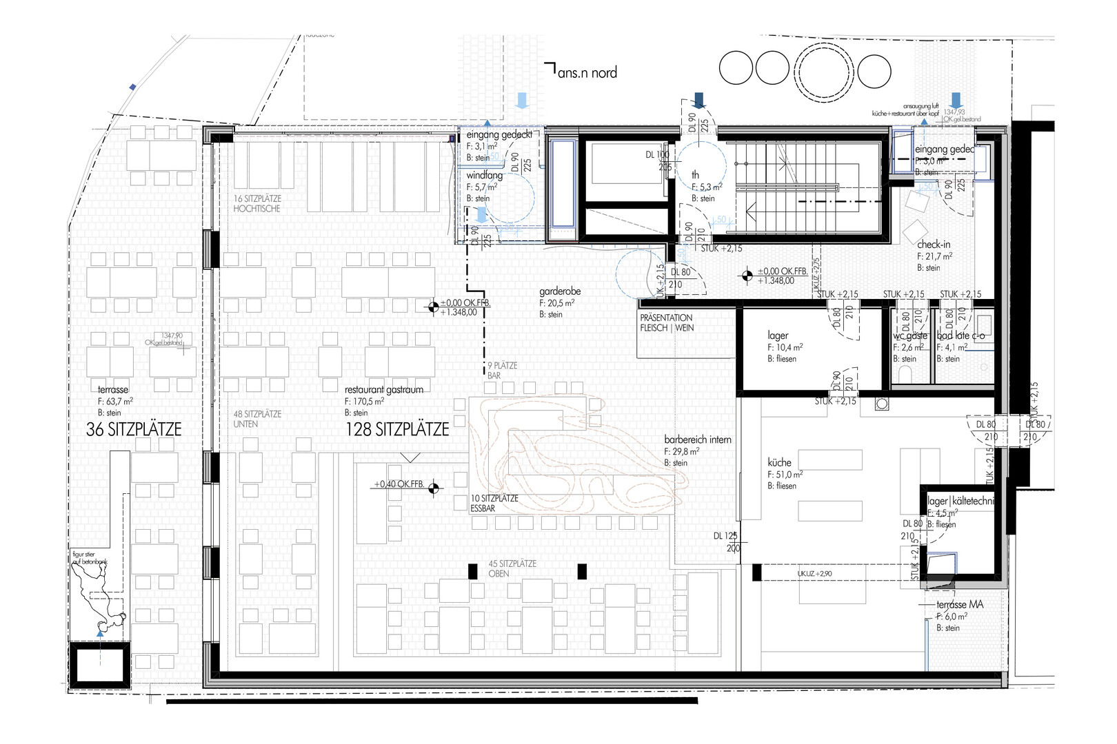 Die Fläche eignet sich ideal für ein Steakhouse, Grill- oder hochwertiges Gastronomiekonzept und bietet noch Mitgestaltungsmöglichkeiten für den zukünftigen Pächter.