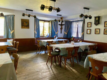 Das denkmalgeschützte Gebäude verfügt über einen großzügigen Eingangsbereich mit Rezeption/Barbereich und historischem Gewölbe. Es gibt zwei sehr gemütliche Gaststuben, beide mit Kachelofen. Der Küchenbereich, mit Lager und Kühlraum ist sehr großzügig angelegt, jedoch teils sanierungsbedürftig. WC-Anlagen sind im Erdgeschoß vorhanden.