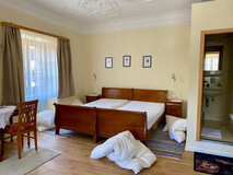 Im 1. OG befindet sich ein großzügiger Gang/Mittelraum, der als Aufenthaltsfläche dient, von hier ist nach Osten und Westen der Zugang zu den 7 Gästezimmern, die mit kleinen Badezimmern ausgestattet sind, sowie einem Aufenthaltsraum mit einer kleinen Küche, Bügelzimmer, Waschraum und eine allgemeine WC-Anlage. Von hier gibt es auch einen separaten Zugang von außen, der unter anderem in den Garten führt.