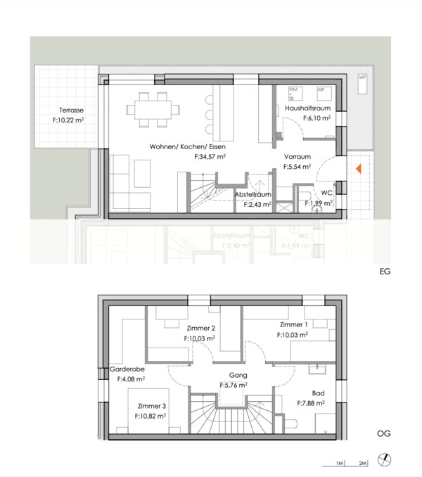 Das zweigeschossig bereits fertiggestellte Haus bietet auf ca. 100 m² Wohnfläche idealen Raum für die ganze Familie. Im Erdgeschoss befinden sich der offene Wohn-/Ess-/Kochbereich mit direktem Zugang zur Terrasse und in den großzügigen Garten, außerdem Windfang/Garderobe, Gäste-WC, Abstellraum und Technikraum. Im Obergeschoss liegen zwei Kinderzimmer, das Elternschlafzimmer mit angeschlossenem Schrankraum sowie das Badezimmer mit WC. Zum Haus gehören zwei KFZ-Stellplätze, die den Wohnkomfort perfekt ergänzen und bequemes Parken direkt am Grundstück ermöglichen.