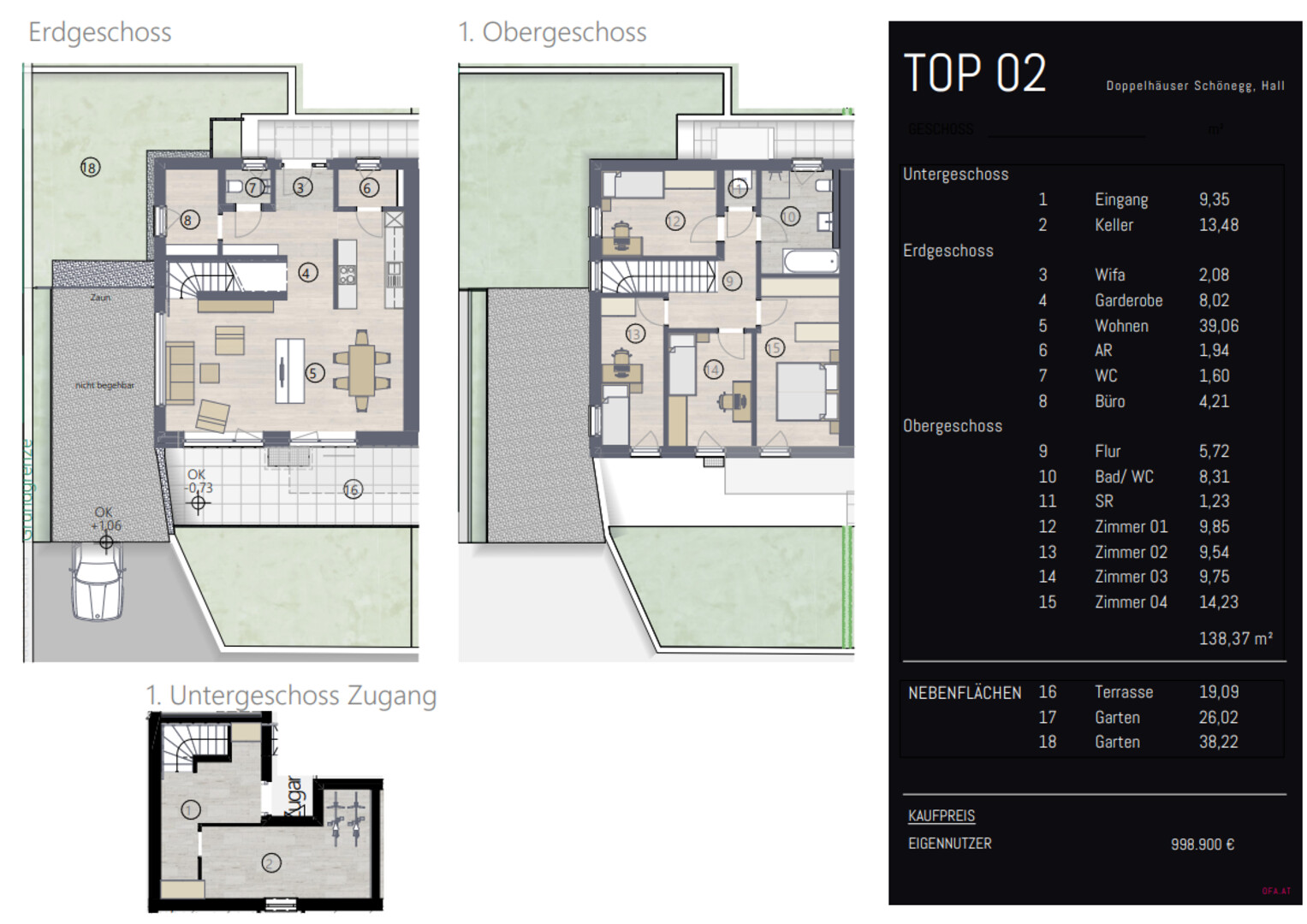 Im östlichen Teil von Hall, im Stadtteil Schönegg, entstehen drei Doppelhäuser in Holzbauweise in einer ganz besonderen Ruhelage, mit bester Besonnung. Jede Doppelhaushälfte verfügt über einen sonnigen Garten, indem man optional ein Gartenhaus erreichten lassen kann. Mit einer großzügigen Terrasse und zwei Tiefgaragenstellplätze werden die Häuser komplettiert. Besucherparkplätze stehen in der Garage ebenfalls zur Verfügung. Die zwei Tiefgaragenplätze sind bereits im Kaufpreis inbegriffen!