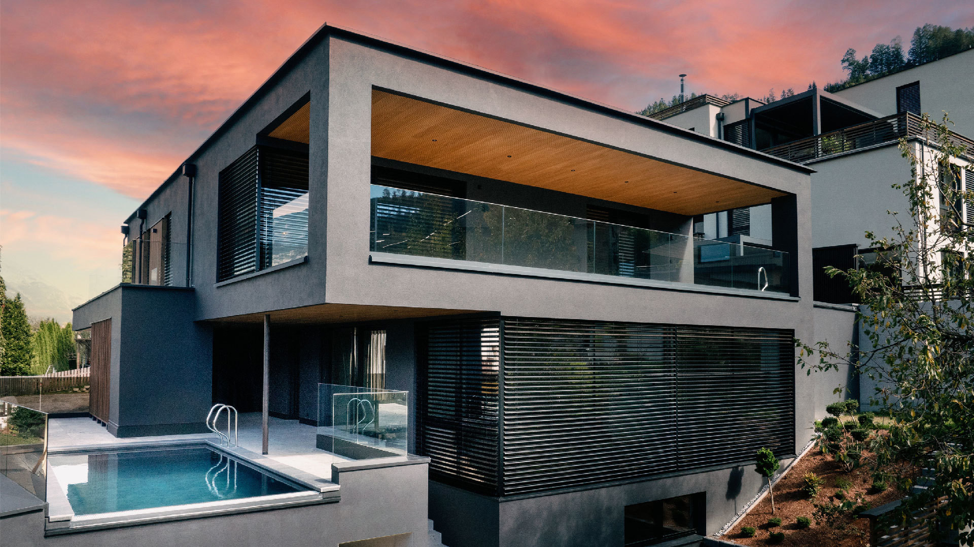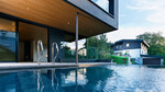 Als absolutes Highlight begeistert im Außenbereich ein luxuriöser Infinitypool samt Gegenstromanlage, Sitzbank und Solar-Lamellen, die zusätzlich zur Luftwärmepumpe das Wasser beheizen.
