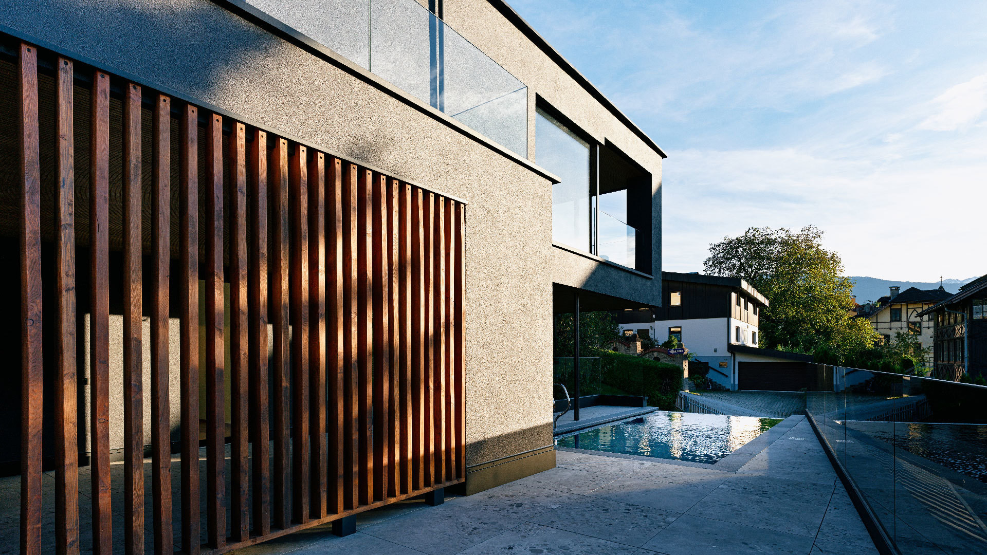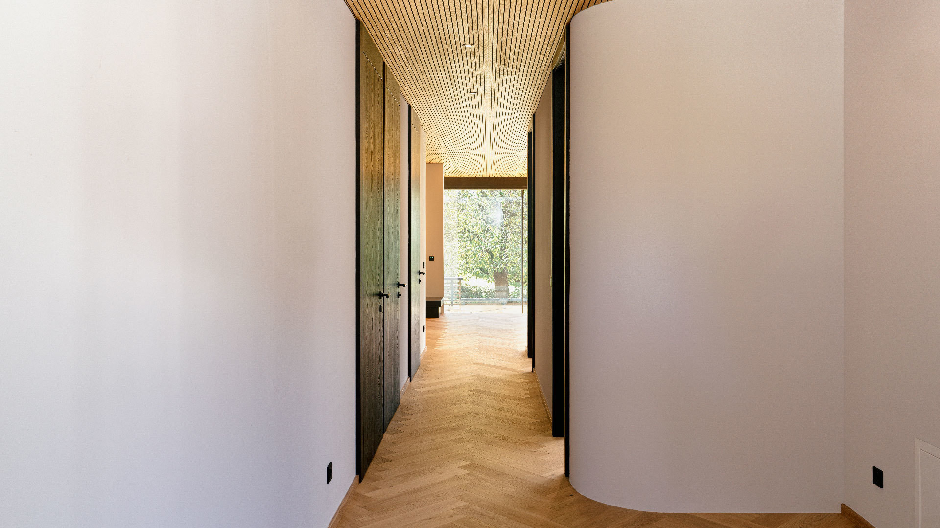 Im Innenbereich sorgen raffinierte Fischgrätböden und Holzlamellen-Decken für eine prägnante Optik. Deckenhohe Türen verbinden die verschiedenen Wohlfühlbereiche und ein offener Kamin hüllt den Wohnbereich in ein warmes Ambiente. Raumhohe Holz-Aluminium-Fenster runden das luxuriöse Wohnerlebnis ab.