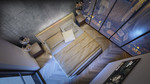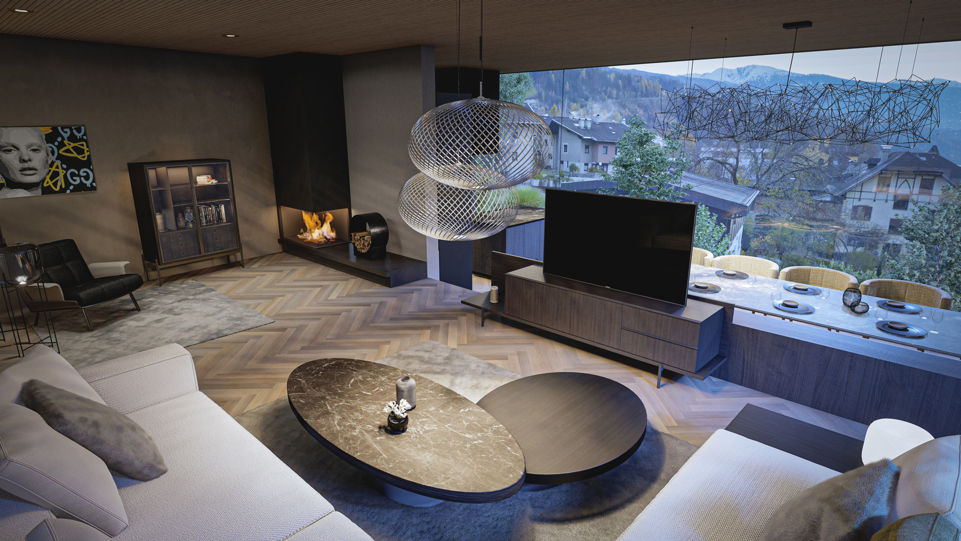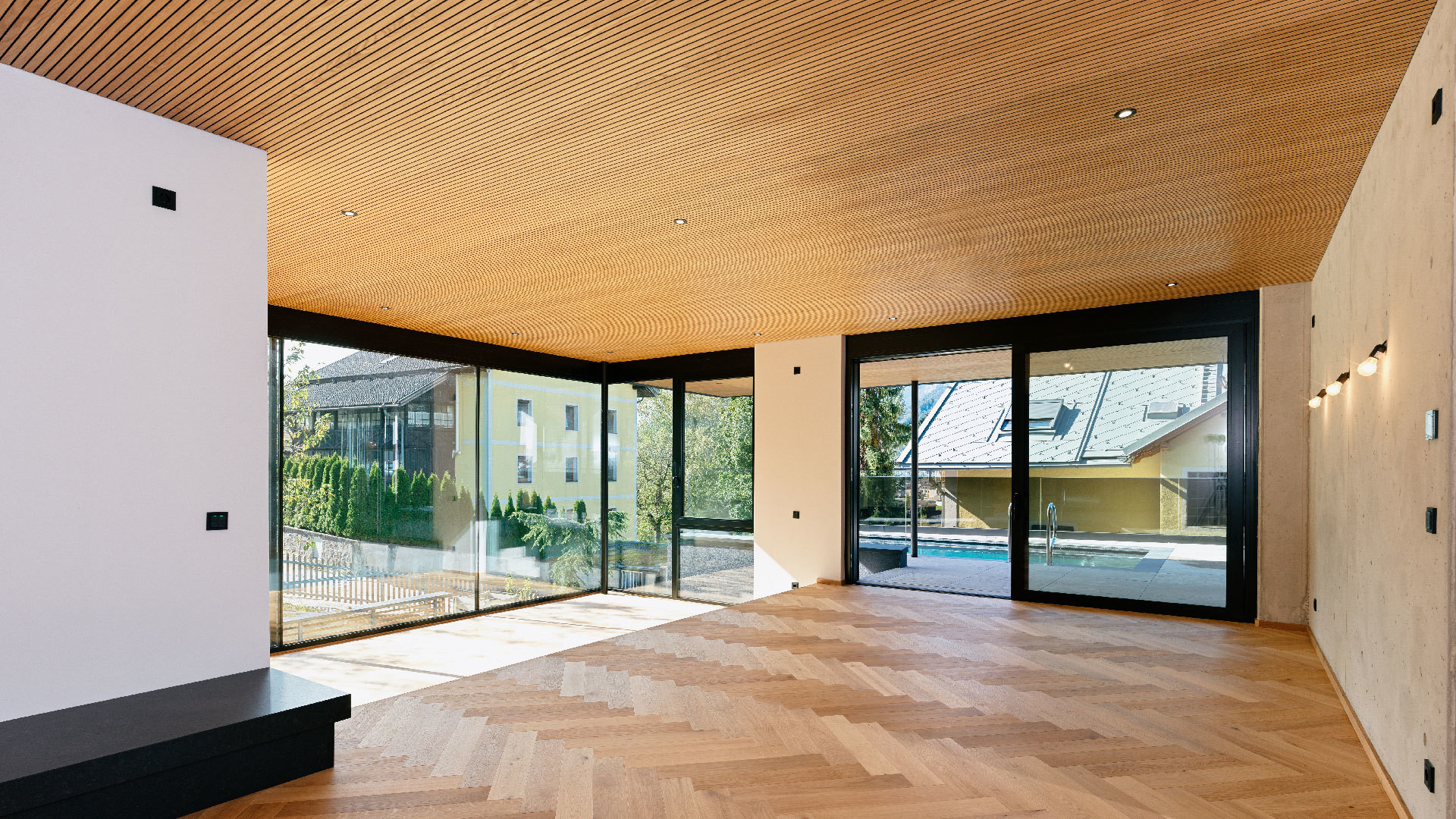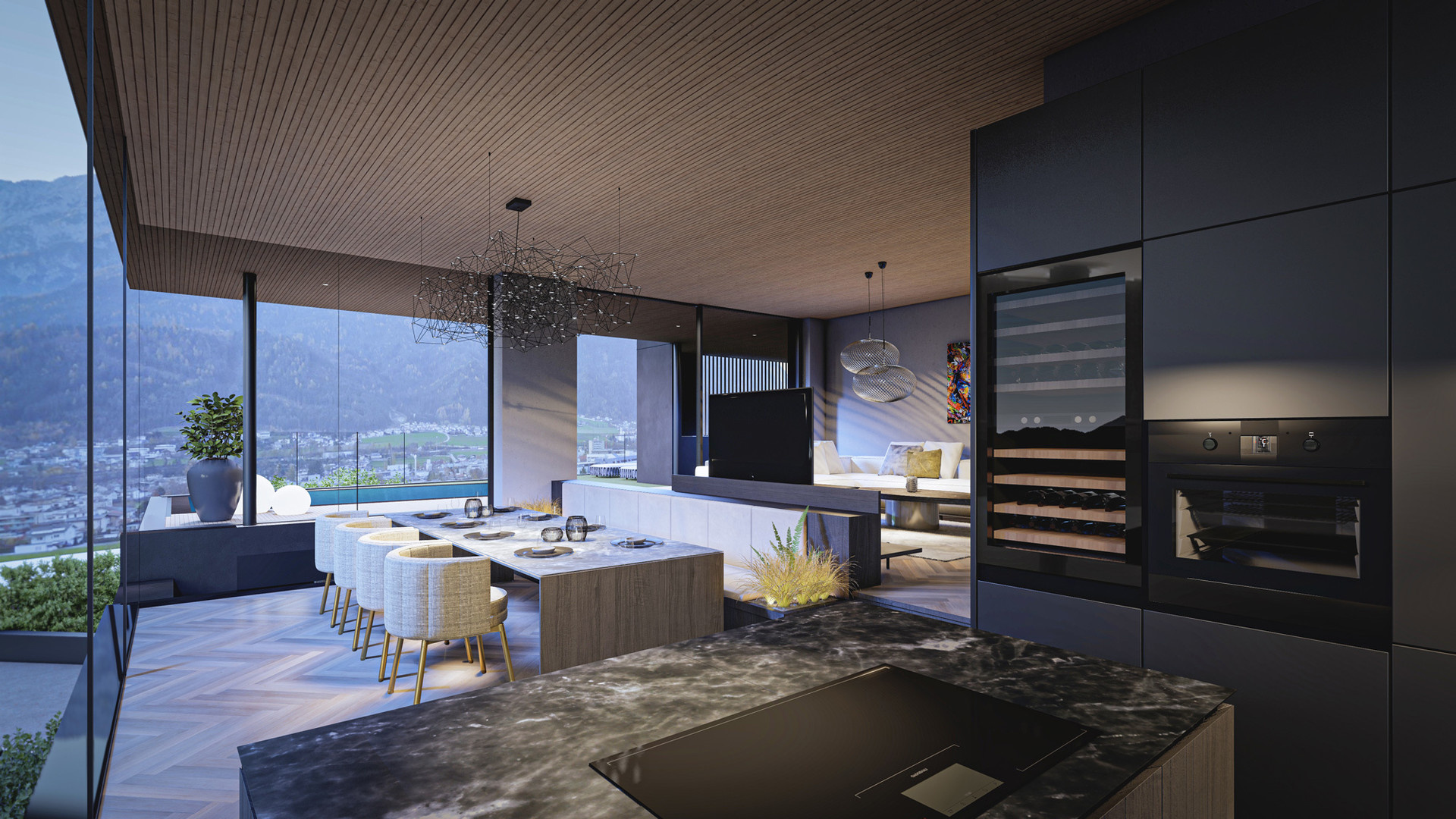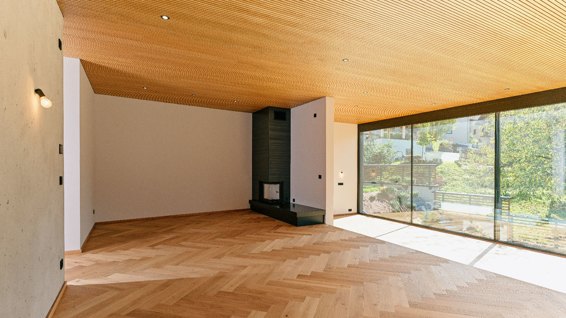 Der offene Wohnbereich vereint Natürlichkeit und Moderne. Raumhohe Fenster eröffnen einen herrlichen Weitblick und die Ausstattung aus Holzlamellen-Decken, Fischgrätböden und Wänden in Betonoptik schafft ein besonders hochkarätiges Raumklima.