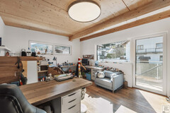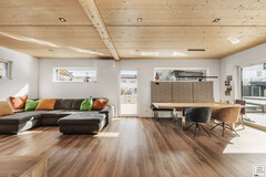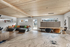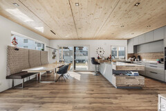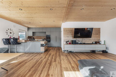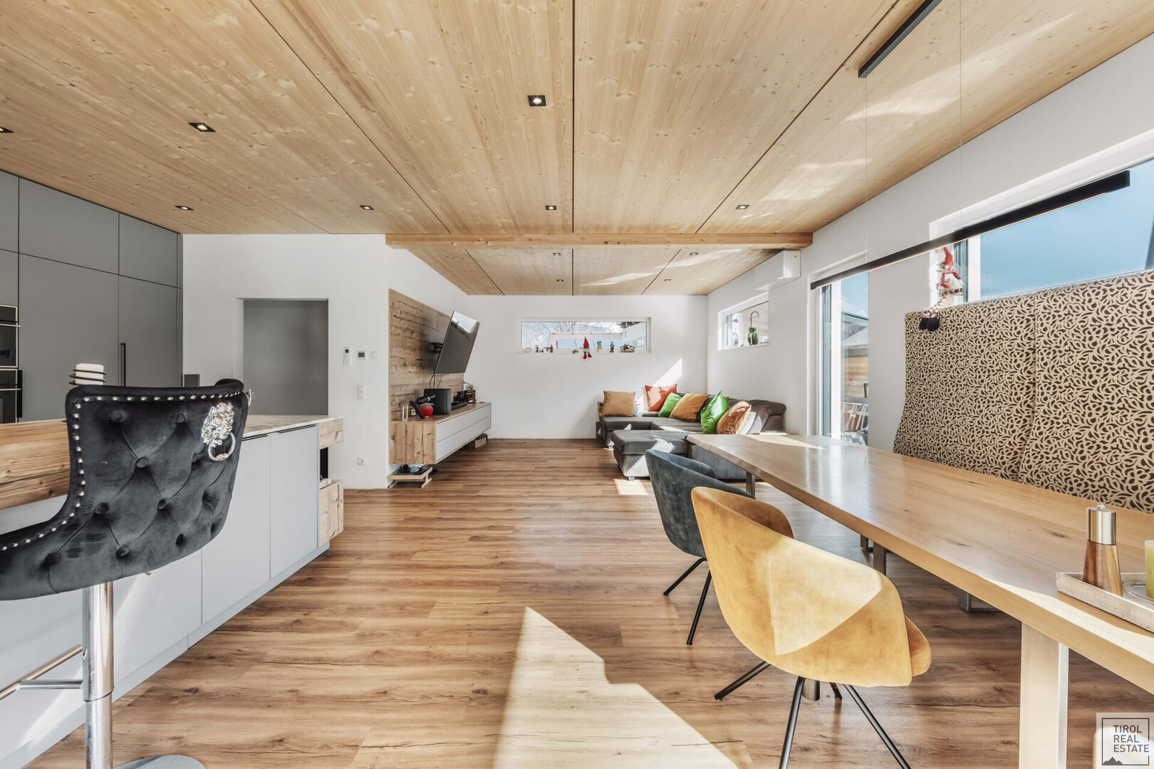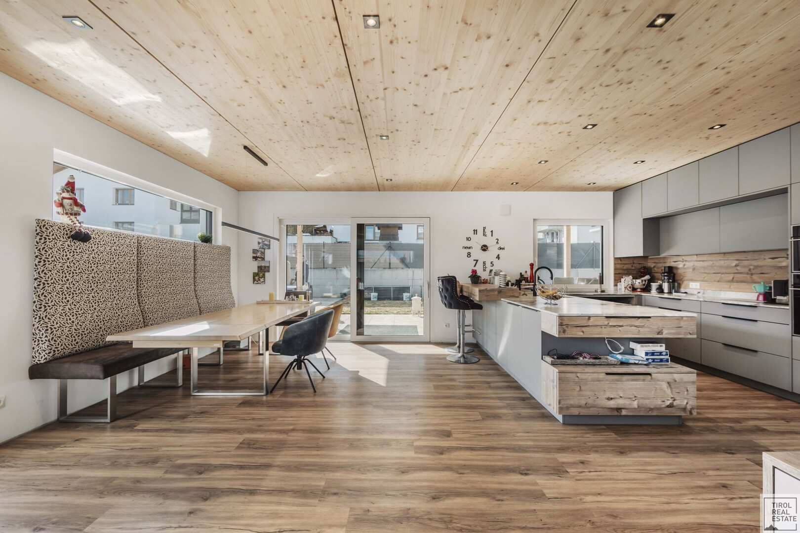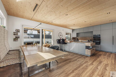 Das Herzstück des Erdgeschosses bildet der offen gestaltete Wohn-, Koch- und Essbereich, der durch seine Großzügigkeit und die lichtdurchflutete Gestaltung ein besonders angenehmes Wohngefühl vermittelt. Ein eleganter Vinylboden in hochwertiger Holzoptik, warme Holzdecken mit integrierten Spots sowie großflächige Fensterflächen schaffen eine moderne und zugleich gemütliche Wohnatmosphäre.