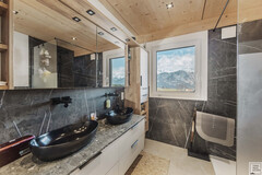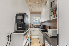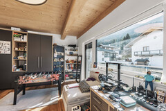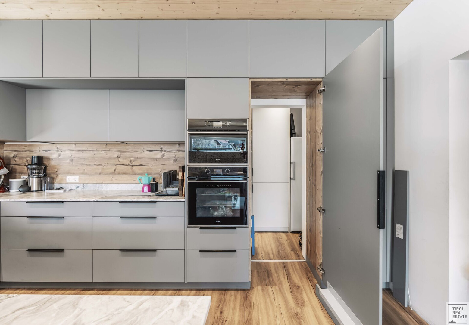 Die maßgefertigte Tischlerküche überzeugt durch ihre hochwertige Ausstattung und durchdachte Planung. Eine exklusive Naturstein-Arbeitsplatte von Strasser sowie moderne Küchengeräte von Teka und Bosch, darunter ein Induktionskochfeld, sorgen für höchsten Komfort beim Kochen. Ergänzt wird der Küchenbereich durch eine separate Speisekammer mit Fenster, die auch ideal als Vorbereitungsküche genutzt werden kann.