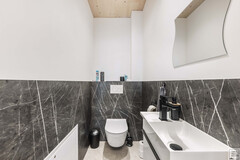 Das moderne Tageslichtbadezimmer ist über eine formschöne Glasschiebetür erreichbar und überzeugt mit einer großzügigen Walk-in-Dusche, Badewanne sowie Waschmaschinenanschluss. Ergänzt wird diese Ebene durch eine separate Toilette mit Waschbecken.