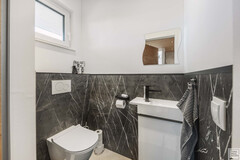 Bereits beim Betreten des Hauses empfängt Sie ein großzügig gestalteter Eingangsbereich mit integrierter Garderobe, der einen repräsentativen ersten Eindruck vermittelt. Ein stilvoll ausgestattetes Gäste-WC mit Fenster, Waschbecken und hochwertigem Feinsteinzeugboden ergänzt den Eingangsbereich und bietet zusätzlichen Komfort für Bewohner und Gäste.