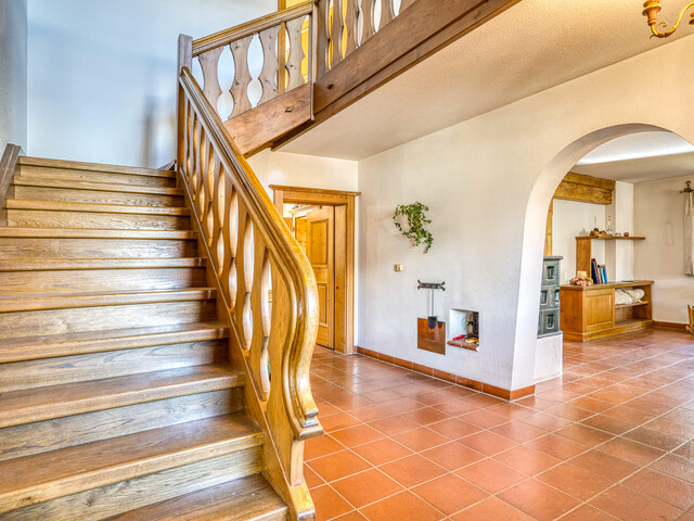 geschwungenem Handlauf erreichen Sie das Obergeschoss mit großen Verteilerflächen in die