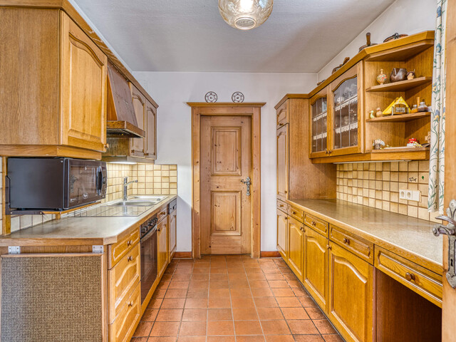 Terrasse und die große Grünfläche. Eine Vollholzküche mit einem Abstellraum sowie ein