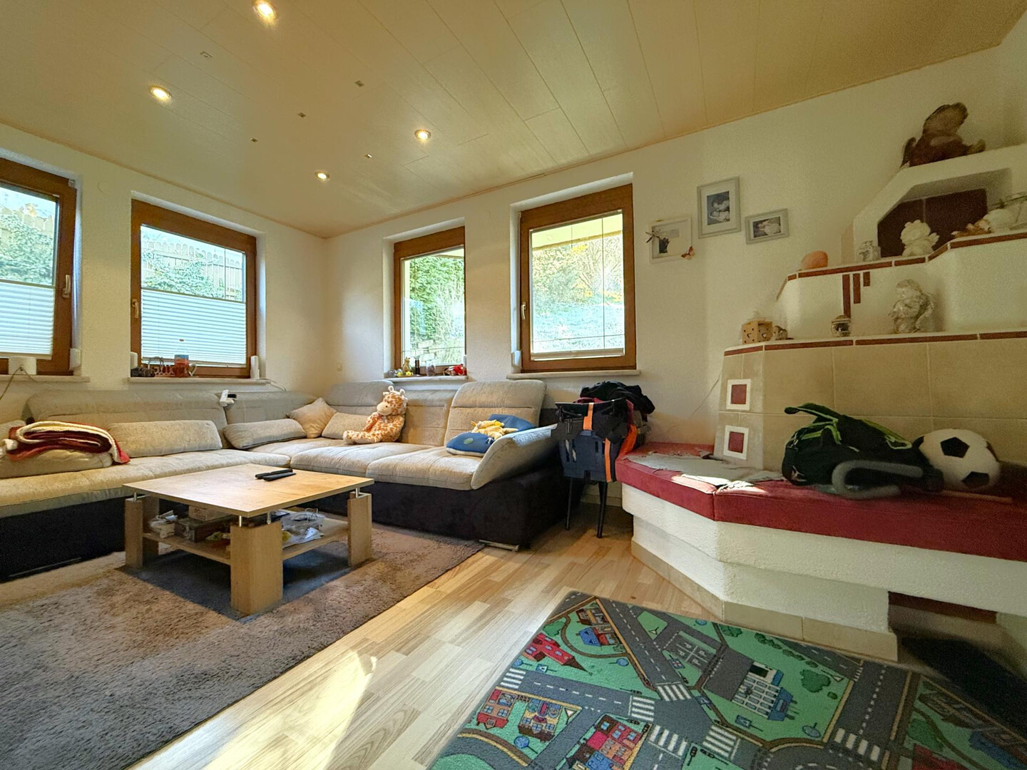 Bereits im Eingangsbereich werden Sie von einer großzügigen Garderobe und einem kleinen Badezimmer mit Dusche und WC empfangen. Im nächsten Halbstock erwartet Sie der zentrale Wohnbereich mit einem gemütlichen Wohnzimmer, einem Esszimmer und einer voll ausgestatteten Küche. Der knisternde Holzofen sorgt für wohlige Wärme, während die Südwest-Terrasse und der liebevoll angelegte Garten ideale Orte für entspannte Stunden im Freien bieten.