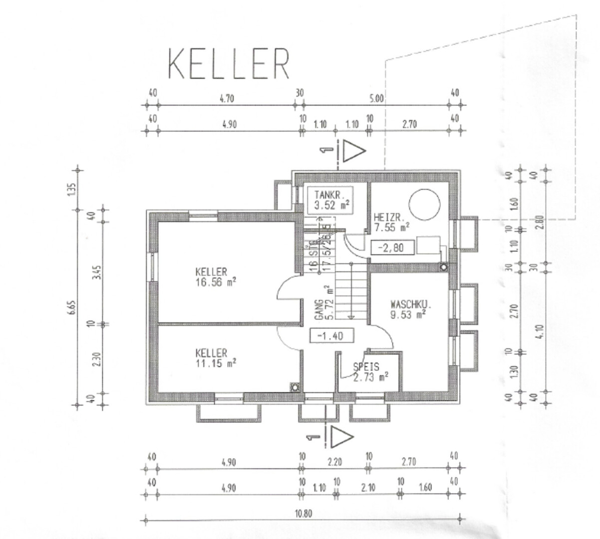 Der Keller mit einer Fläche von ca. 56,76 m² eröffnet Ihnen vielseitige Nutzungsmöglichkeiten. Ein helles Zimmer mit zwei Fenstern eignet sich ideal als weiteres Schlafzimmer oder als ruhiger Arbeitsbereich. Zusätzlich stehen ein Kellerraum, eine praktische Speisekammer und eine geräumige Waschküche zur Verfügung. Im untersten Halbstock befinden sich der Heizraum, der Tankraum und die zentrale Staubsaugeranlage – alles, was für den reibungslosen Hausbetrieb nötig ist.