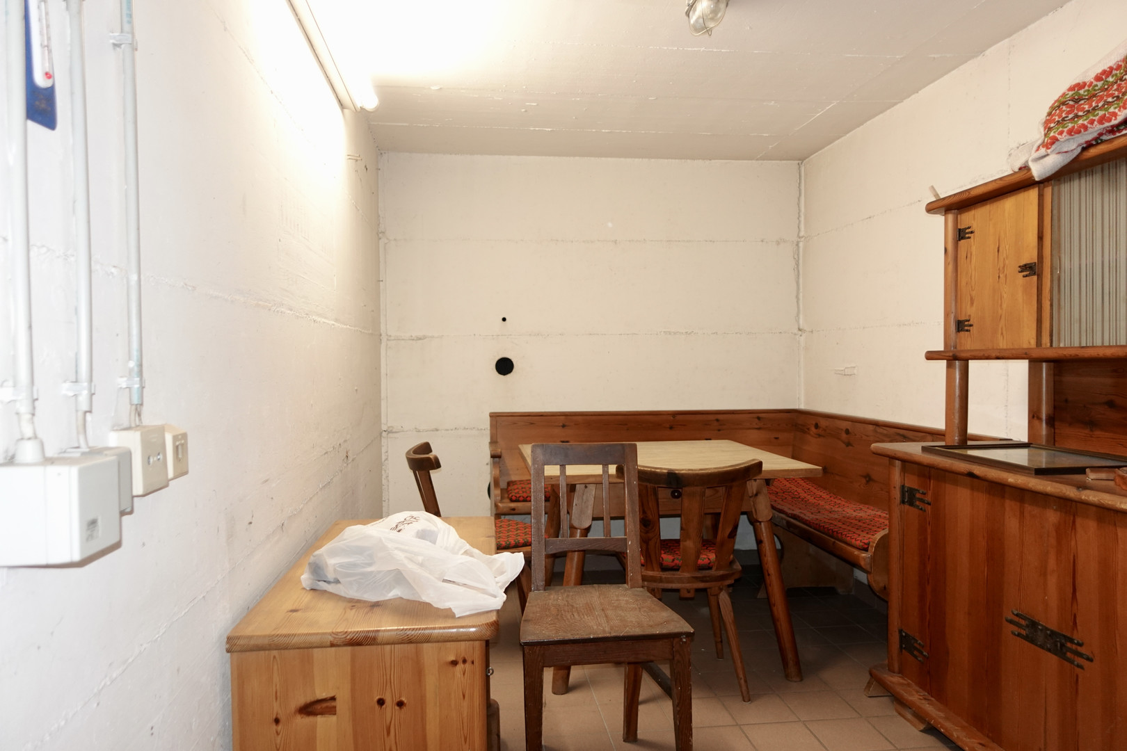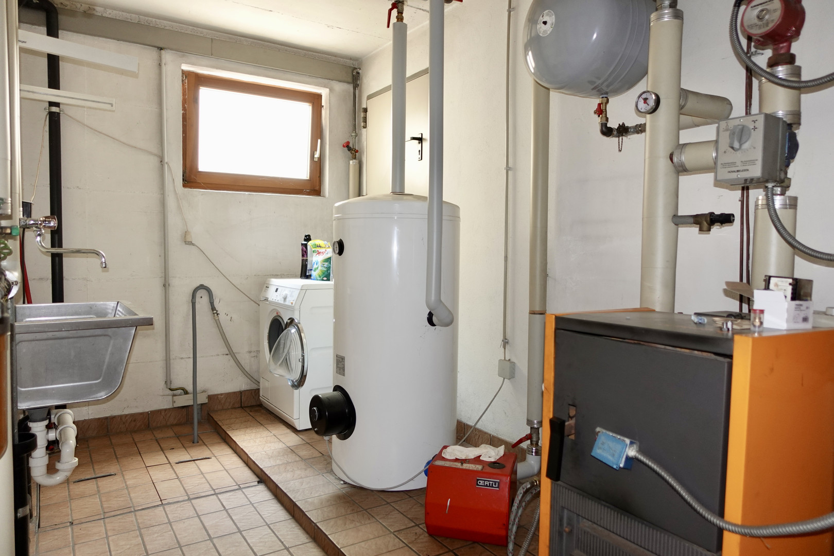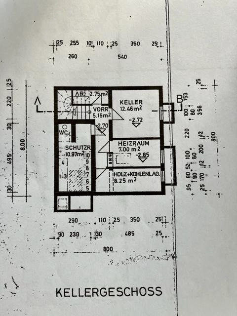 Kellergeschoss: 1 Vorraum, 1 Abstellkammer, 1 Kellerraum, 1 Schutzraum, 1 Heizraum und 1 Holz + Kohlelager.