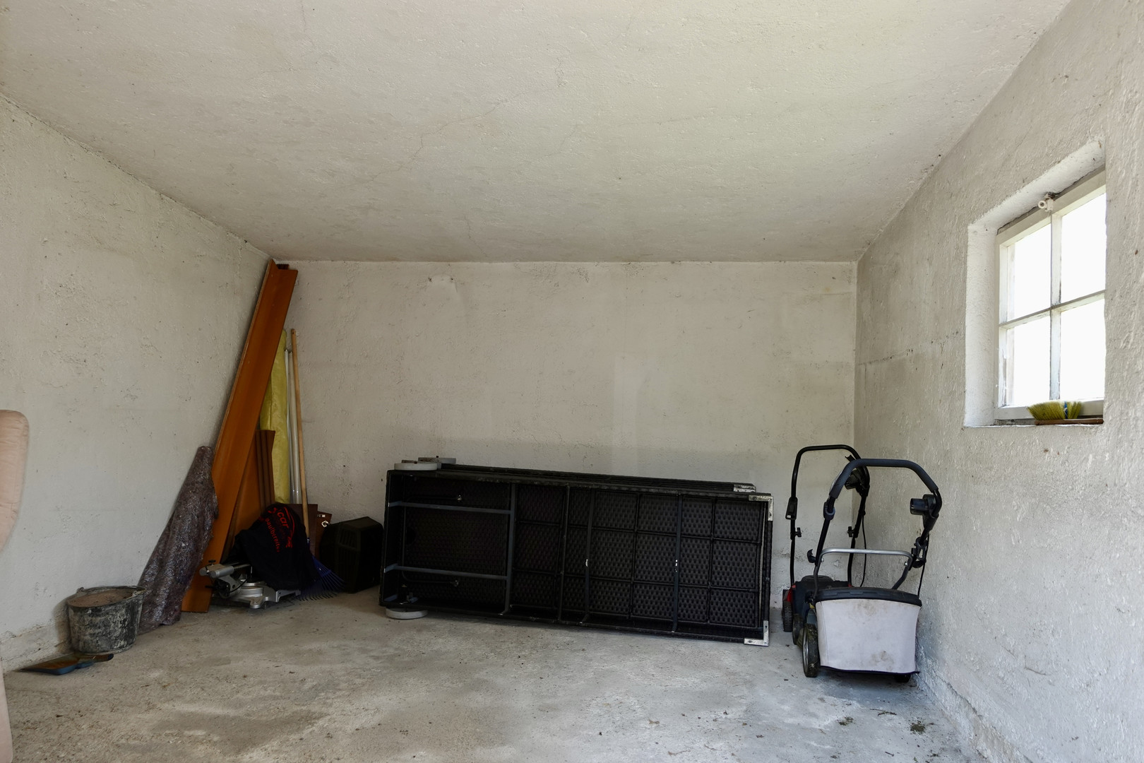 Aussenbereich: Terrasse, Garten, Vorplatz und eine Garage mit Strom.