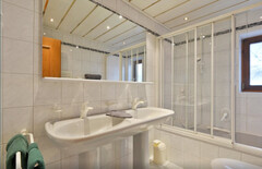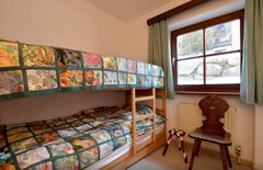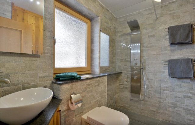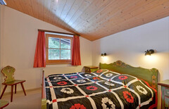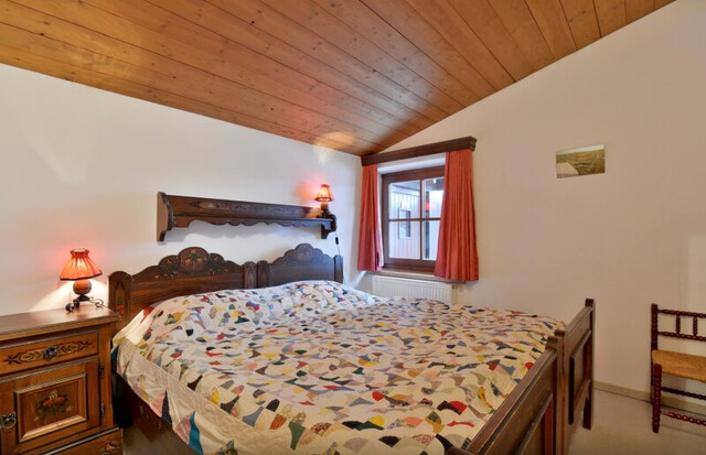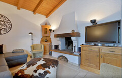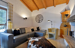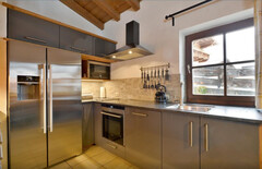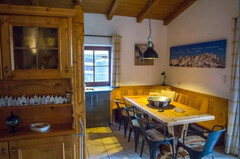 Die Küche mit integriertem Essbereich wurde im Zuge der letzten Sanierung 2014 erneuert und lädt zu geselligen Stunden ein. Der offene Dachstuhl verleiht dem Wohnbereich ein luftiges Raumgefühl und verstärkt das alpine Flair.