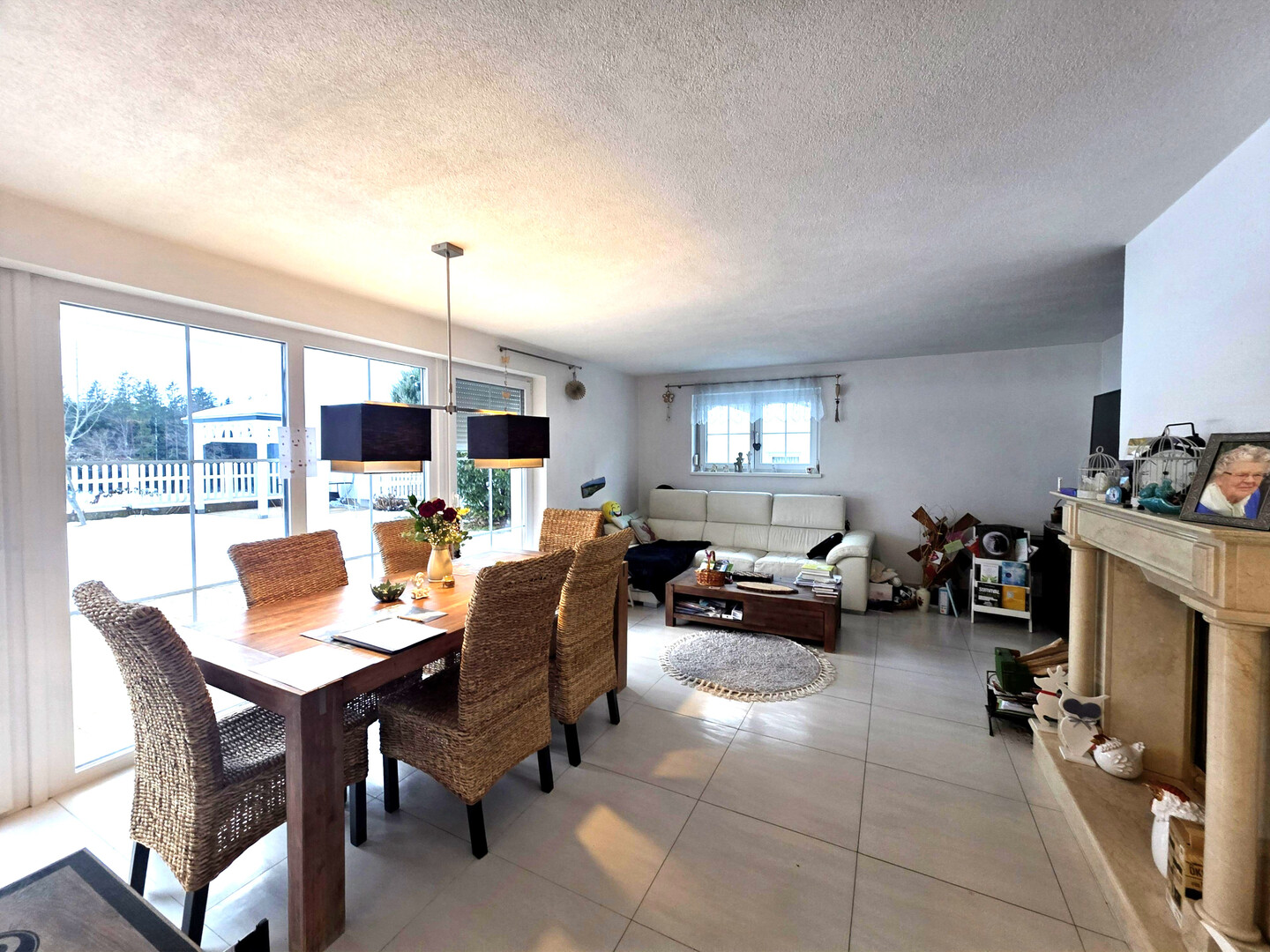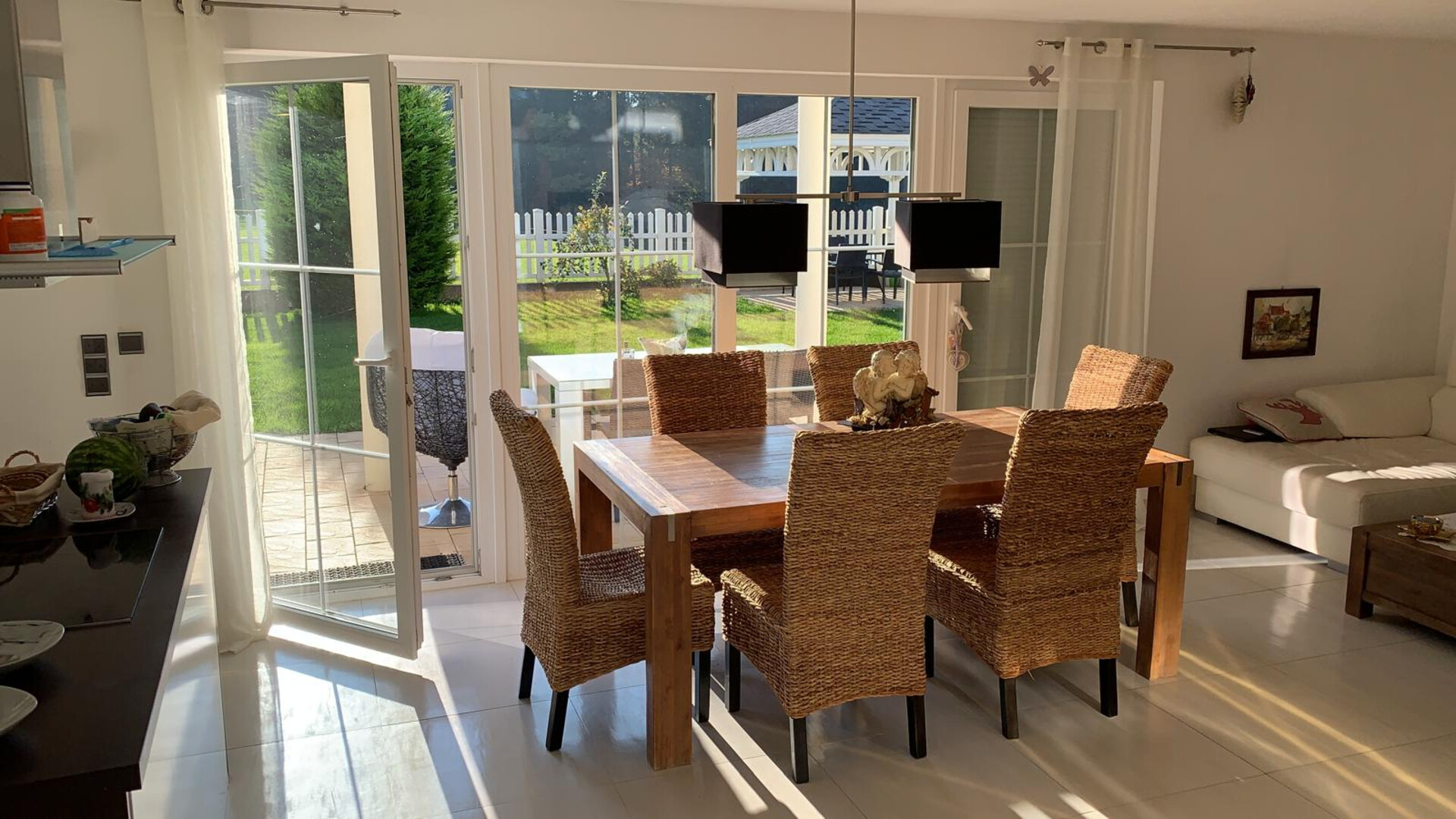 Schon das repräsentative Entrée vermittelt Großzügigkeit und Stil. Der offene Wohn-, Ess- und Küchenbereich bildet das Herzstück des Hauses: modern geplant mit Kochinsel, lichtdurchflutet durch große Fensterflächen und mit direktem Zugang zur sonnigen Terrasse sowie in den ca. 385 m² großen Garten mit Pavillon. Ein offener Kamin mit integriertem Ofen/Kachelofen sorgt hier für eine besonders behagliche Atmosphäre – ein echtes Highlight für gemütliche Abende und zugleich ein stilprägendes Element des Wohnraums.