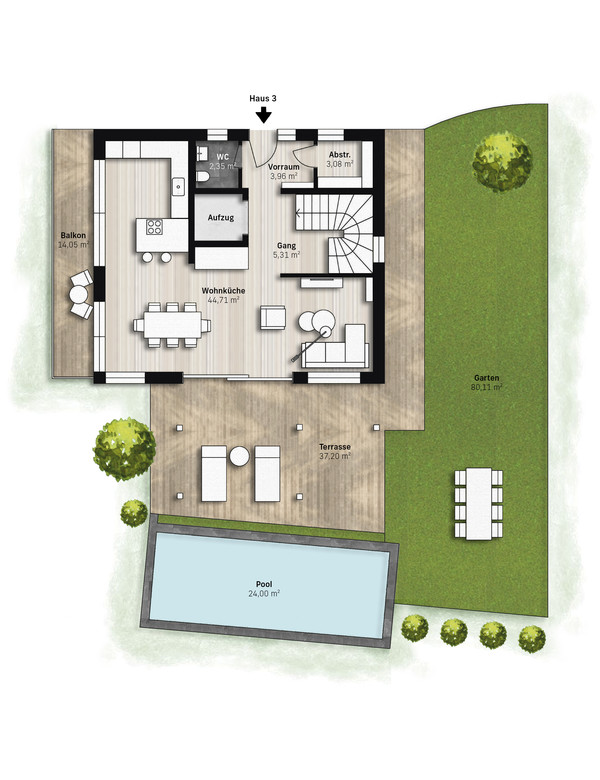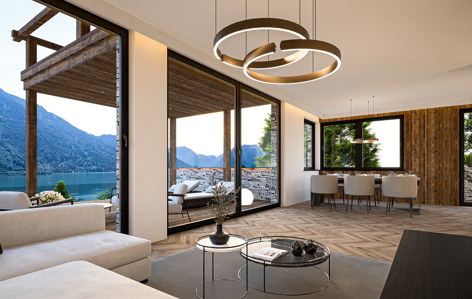 Was der Innenbereich mit seiner Raffinesse verspricht, setzt sich auch in den Außenbereichen fort. Neben einem traumhaften Garten von 80 m2 verfügen Sie in jeder Etage über eine Terrasse mit Blick auf den türkisgrünen Achensee sowie über einen Balkon. Als hochkarätiges Highlight lädt der Infinity Pool zur Entspannung vor inspirierender Kulisse ein.