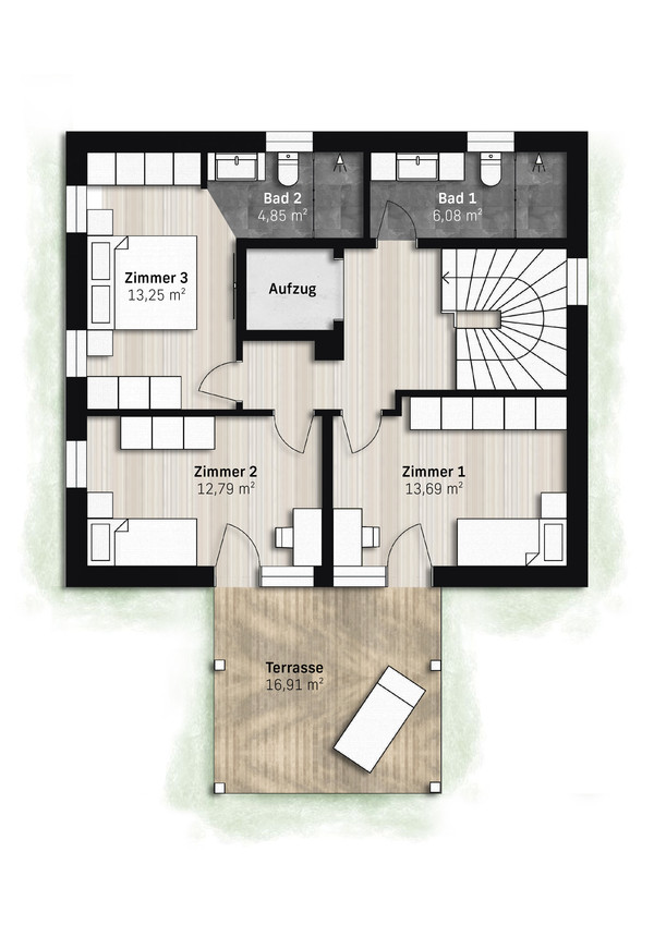 Die Innenausstattung lebt von raffinierten Fischgrätböden, raumhohen Türen und Aluminiumfenstern. Die fertig eingerichteten Bäder erfüllen höchste Ansprüche an Funktion und Ästhetik. Darüber hinaus bereichern ein offener Kamin und eine eigene Sauna Ihre Lebensqualität.