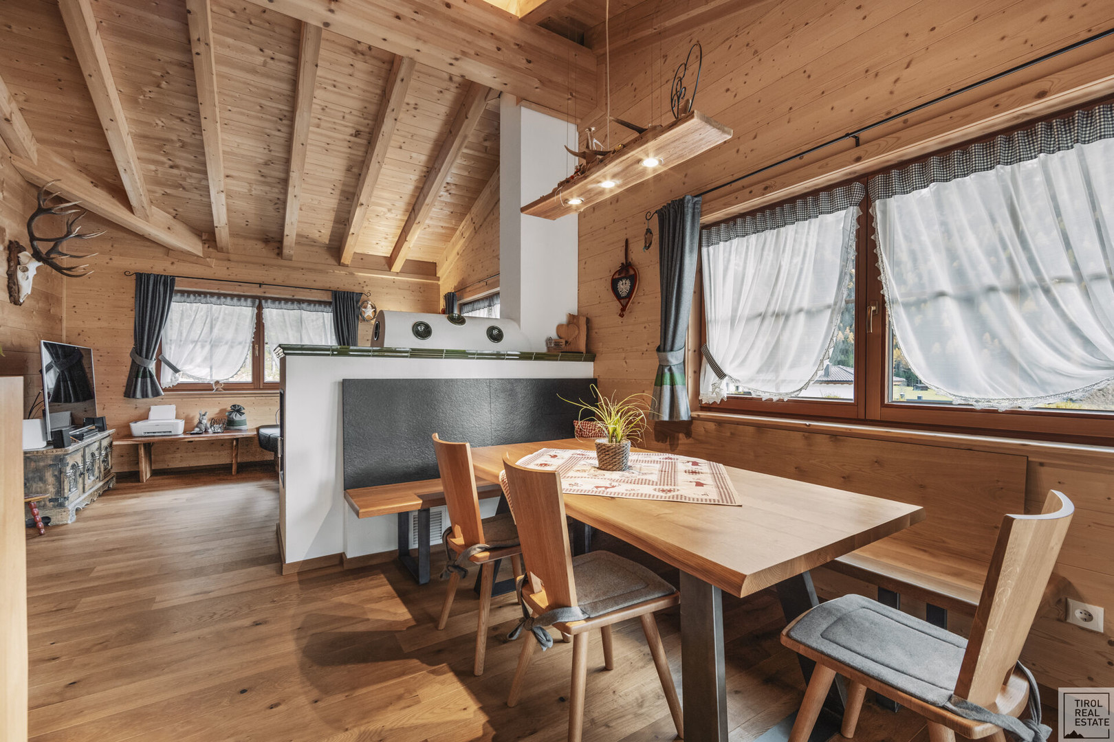 Ein besonderes Highlight ist der gemütliche Kachelofen, der nicht nur an kalten Tagen wohlige Wärme spendet, sondern auch das Wohnambiente mit traditionellem Tiroler Flair bereichert.