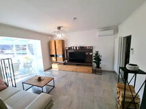 - Wohnzimmer mit Klimaanlage und Kaminofen