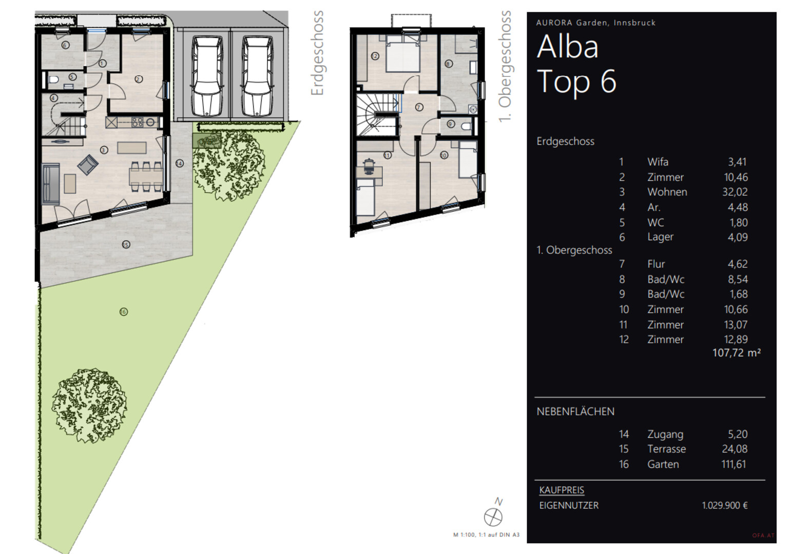 Die südwestliche Ausrichtung der Top 6 Alba sorgt für lichtdurchflutete Räume und eine angenehme Wohnatmosphäre vom Morgen bis in die Nachmittagsstunden. Großzügige Fensterfronten schaffen fließende Übergänge zwischen Innen- und Außenbereich und lassen viel Tageslicht in die Wohnräume. Mit 107,72 m² Wohnfläche und 5 Zimmern bietet das Reihenhaus Raum für individuelle Lebensentwürfe. Die Einheit verfügt über zwei Geschoße. Darunter das Erdgeschoß, welches viel Stauraum, ein Gäste WC und einen großen, offenen Wohn- und Essbereich bietet. Das Highlight des Reihenhauses Alba ist der riesige, private Garten mit der großen, sonnigen Terrasse. Der perfekte Rückzugsort für gemütliche Stunden im Freien. Die drei Räume im Obergeschoß eignen sich durch die clevere Aufteilung perfekt als Schlafzimmer oder Büro- und Hobbyraum, je nach Bedarf. Komplettiert wird das obere Stockwerk mit einem modernen Badezimmer und separatem WC.