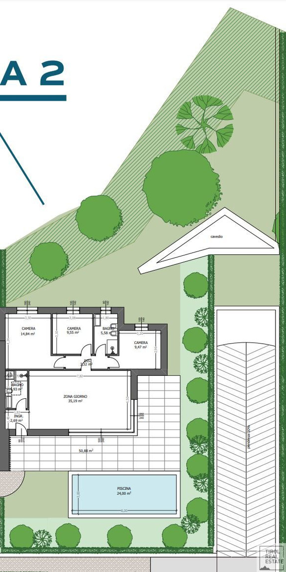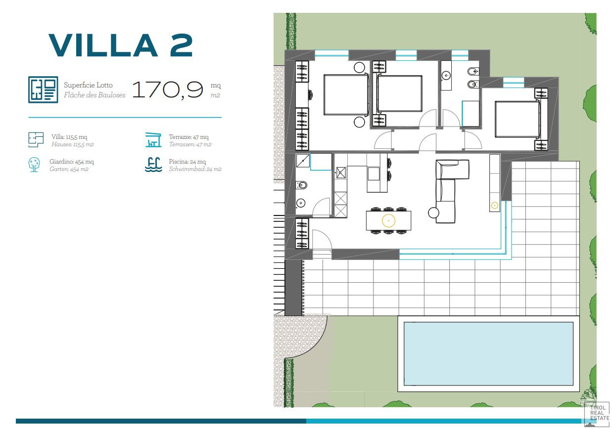 Villa 2 befindet sich in der vorderen Reihe in der Mitte des Rossar Dream Village. Das 589,19 m2 große Grundstück vereint einen großzügigen Außenbereich mit exklusivem Wohnkomfort in traumhafter Lage. Der 454 m2 große Garten und eine großzügige Terrasse laden zu entspannten und sonnigen Stunden im Freien ein. Ein besonderes Highlight ist der private Swimmingpool, der harmonisch in den Garten integriert ist und an warmen Tagen für Erfrischung sorgt.