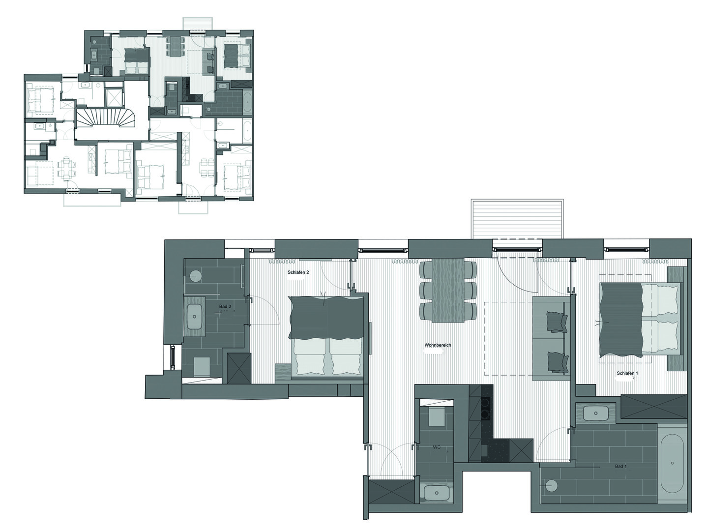 - 3 Zimmer: 2 Schlafzimmer, 1 zentraler Wohn-/Essbereich