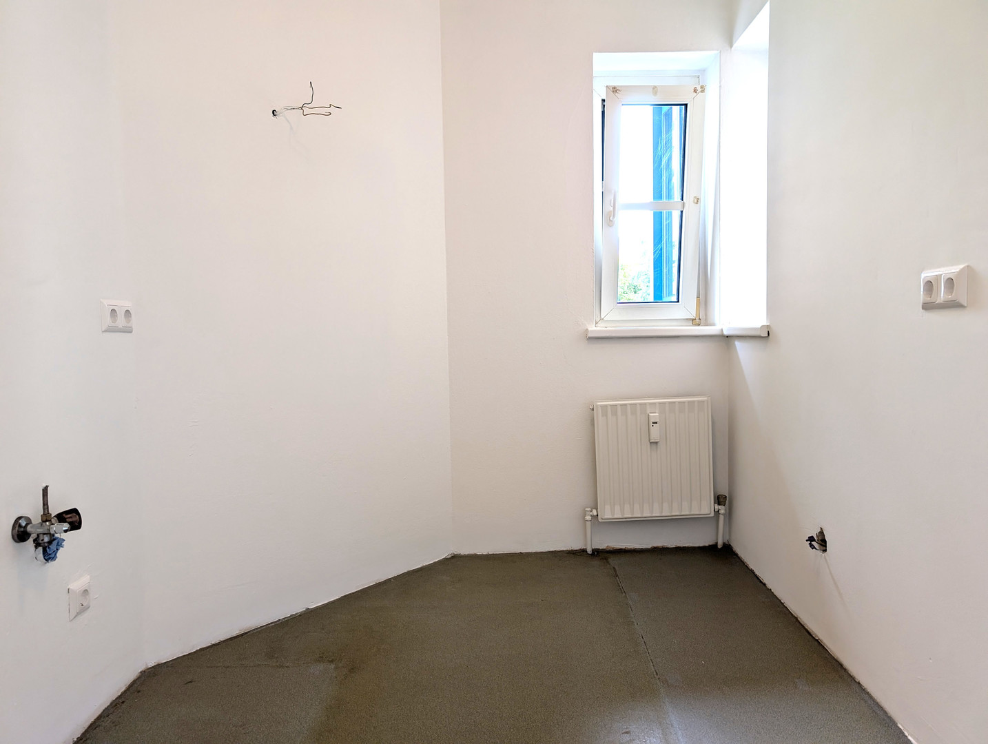 Die Wohnung ist modernisiert und kann sofort bezogen werden. Die Küche ohne Einricchtung wartet mit entsprechenden Anschlüssen auf Küchengeräte, Koch und Köchin.