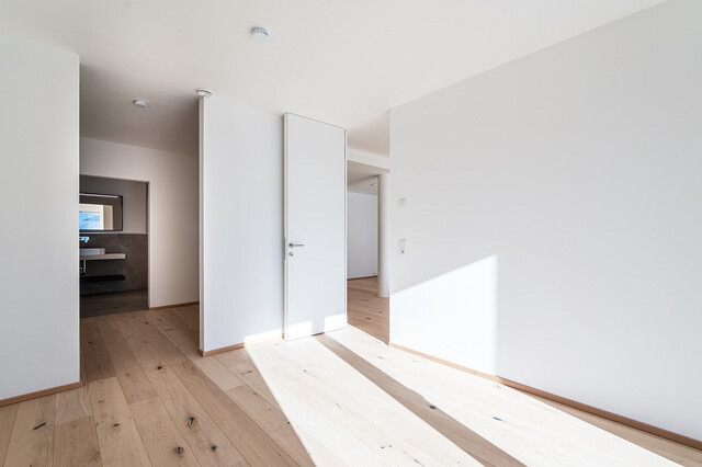 Das Elternschlafzimmer mit Schrankraum und direktem Zugang zum Badezimmer ist als privater Rückzugsort konzipiert – mit eigenem Terrassenausgang und herrlicher Aussicht. Ein weiteres Zimmer – ideal als Kinderzimmer, Gästezimmer oder Büro – bietet ebenfalls direkten Zugang zur Terrasse. Ein separates Gäste-WC mit eigenem Waschtisch und Badewanne unterstreicht die durchdachte Raumplanung und schafft zusätzlichen Komfort.