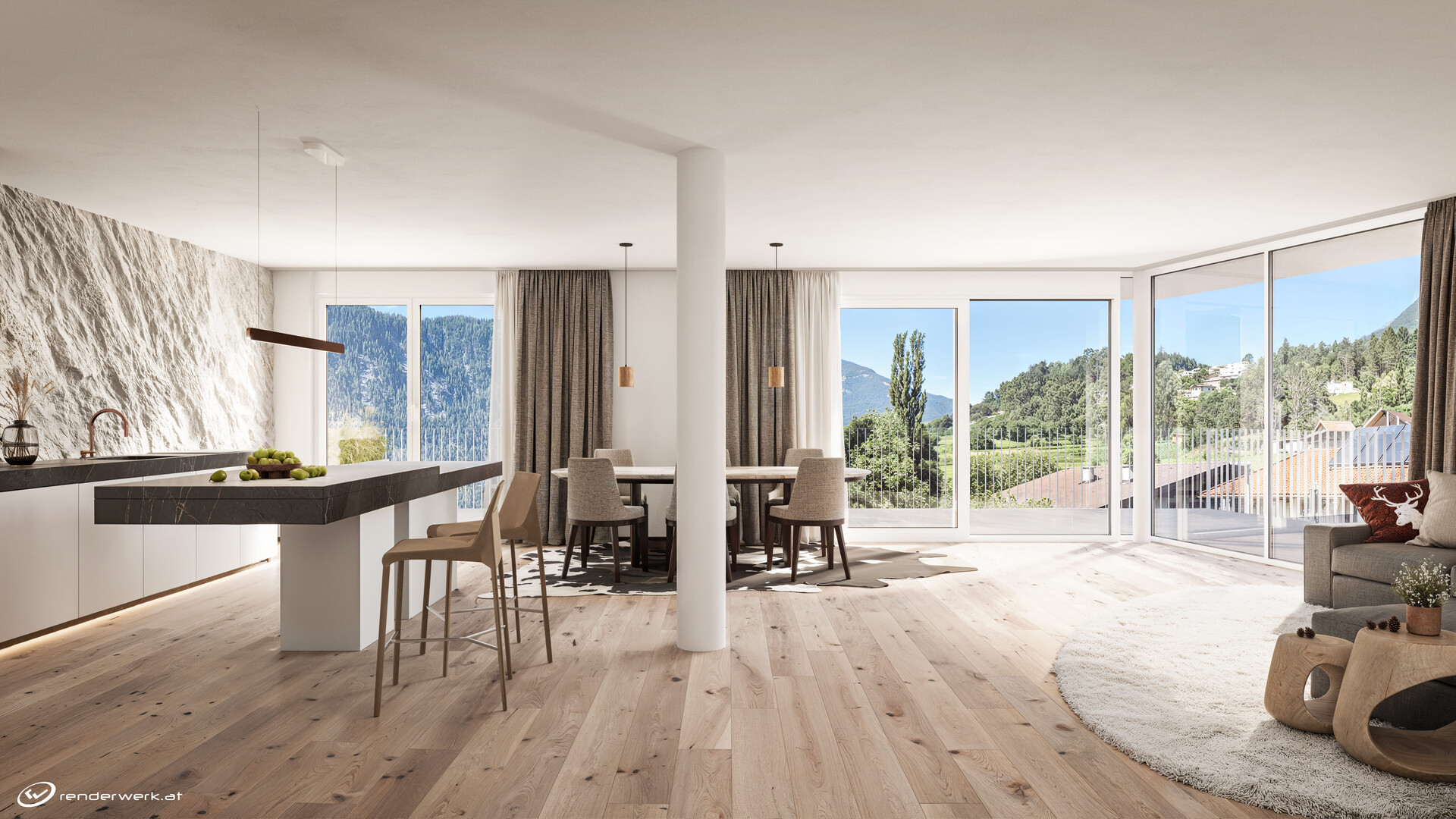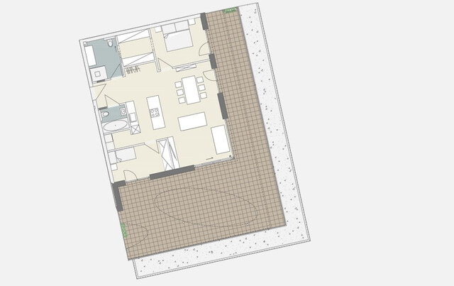 Diese exklusive Wohneinheit überzeugt durch eine ideal durchdachte Raumaufteilung und luxuriöser Ausstattung. Der Mittelpunkt ist der rund 47 m² große Wohn-, Ess- und Kochbereich, lichtdurchflutet und offen gestaltet – mit direktem Zugang über eine Schiebetür auf die umlaufende ca. 94 m² große Terrasse, die sich nach Westen öffnet.
