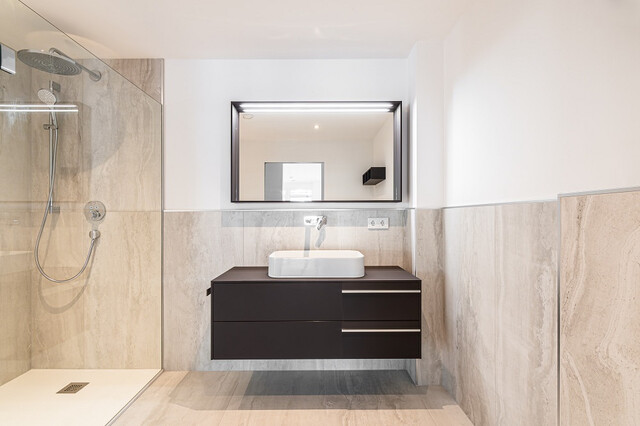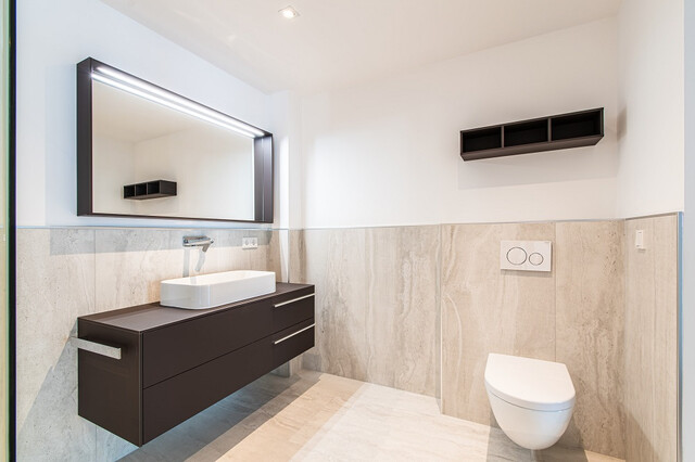 Hochwertige Sanitärobjekte mit modernen Badmöbeln ausgestattet.