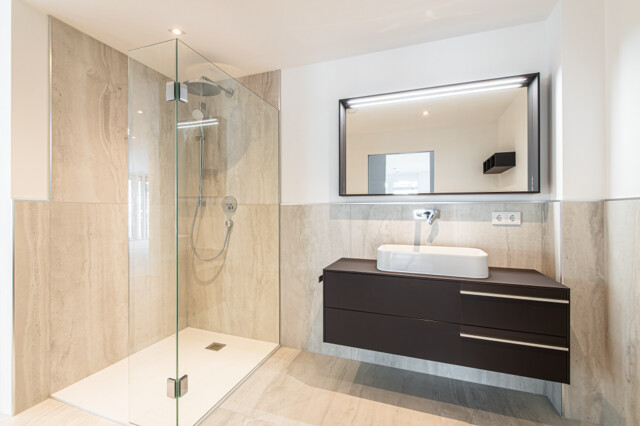 Besonders eindrucksvoll präsentieren sich die obersten beiden Geschosse mit insgesamt sechs luxuriösen Wohnungen. Zwei davon, im ersten Dachgeschoss gelegen, bieten jeweils rund 100 m² Wohnfläche und großzügige, rund 80 m² große Terrassen mit spektakulärer Aussicht. Die vier weiteren Wohnungen erstrecken sich über das erste und zweite Dachgeschoss und bieten ein einzigartiges Wohnkonzept auf zwei Ebenen. Der gesamte Wohnbereich mit großzügigen Grundrissen von ca. 90–100 m² befindet sich im ersten Dachgeschoss und überzeugt durch die durchdachte Raumaufteilung, hochwertige Ausstattung und direkten Zugang zur Terrasse.