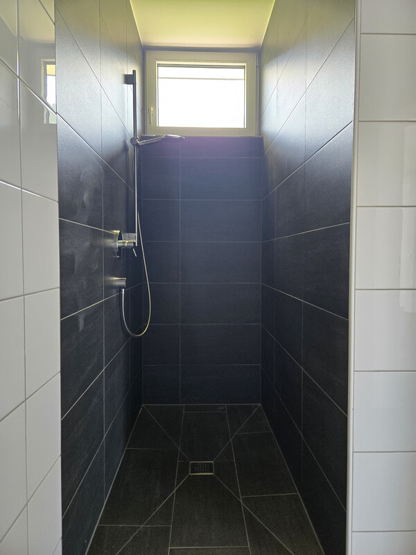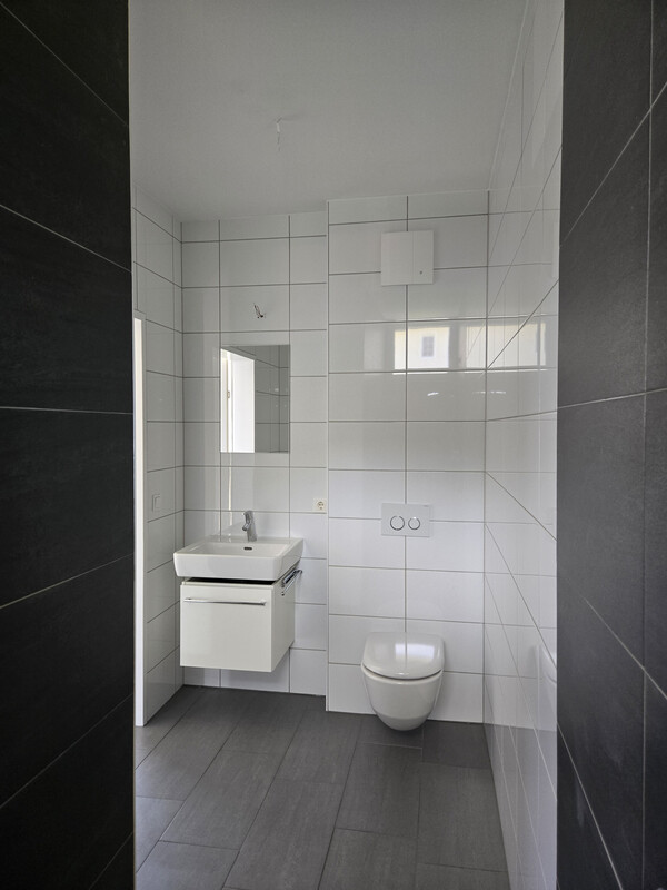 - Bad mit großer bodenbündiger Dusche (Sanitärgegenstände Fa. Laufen und Fa. Hansgrohe)